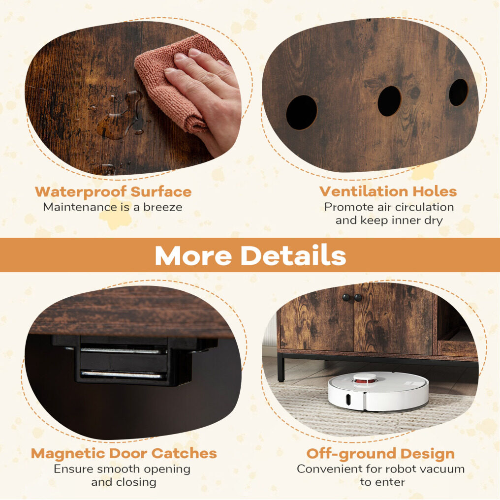 Privacy and Ventilation Combined: The double door cat litter box enclosure prioritizes the privacy of your cats, promoting a sense of security. With a built-in ventilation system to contain smells, the decorative pet furniture ensures a fresh and clean environment. Please make sure your litter box is smaller than 57 x 50 x 40 cm(L x W x H).