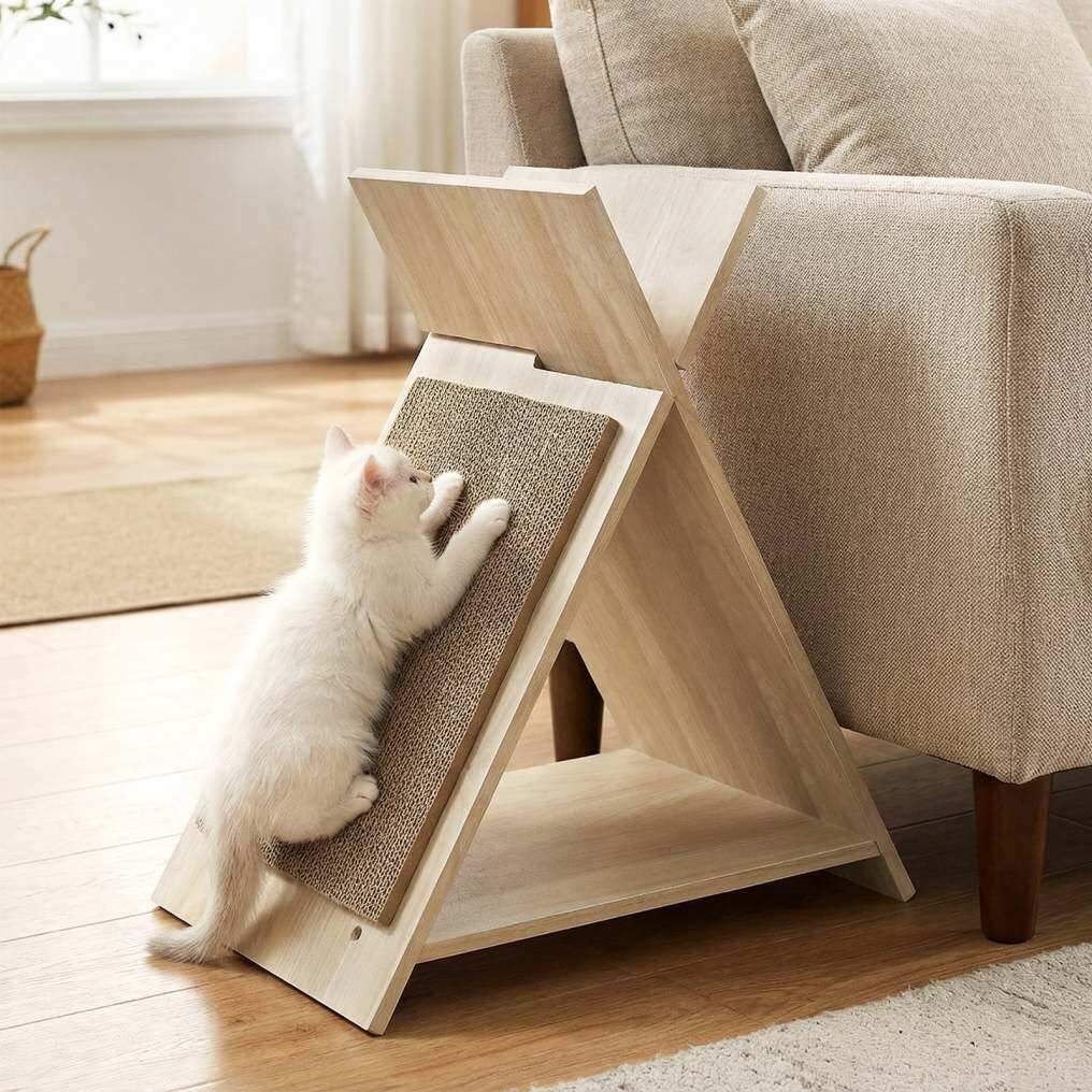 ● Stylish Pet Furniture: Designed with a lifelike wood grain finish and a striking X-shaped silhouette, the compact 18.5" x 12" x 21" cat scratcher ramp effortlessly complements your living room, apartment or bedroom.