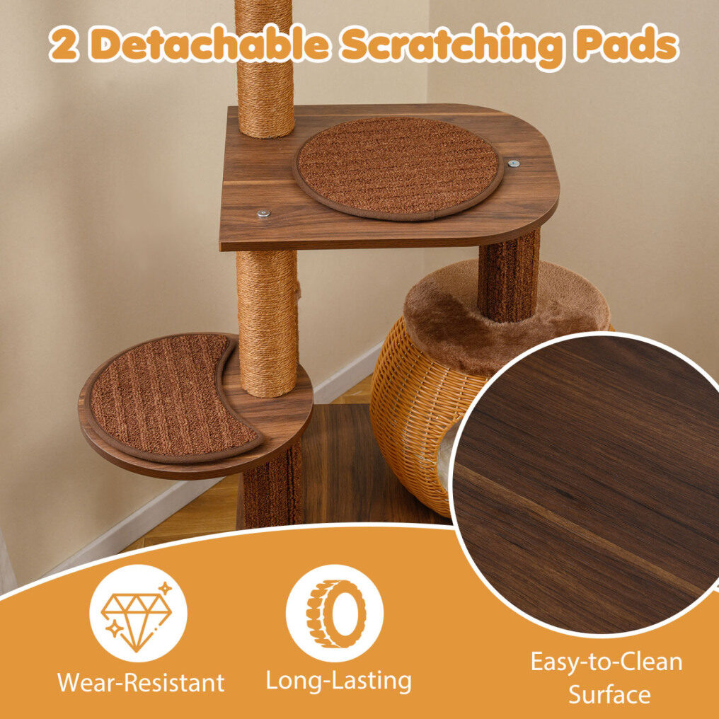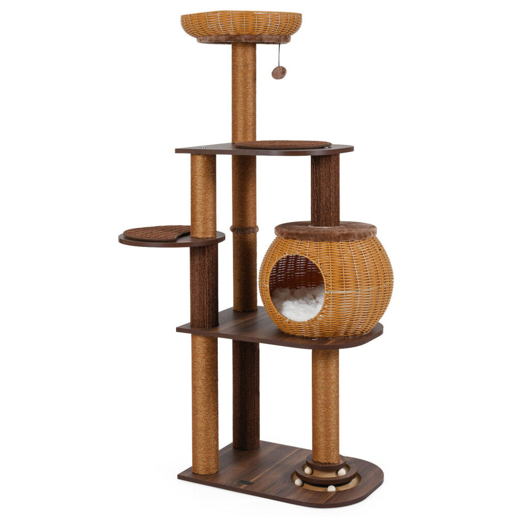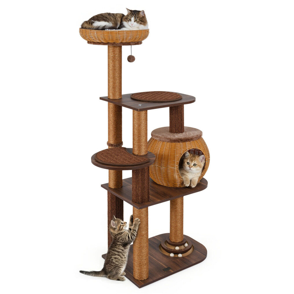 This multi-level rattan cat tree is designed to meet your cat’s daily needs for scratching, resting, climbing and play.
