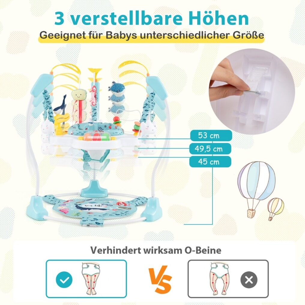 3 Adjustable Heights: This baby spinning top can be adjusted to 45cm, 49.5cm or 53cm (height from table to floor), suitable for children of different heights. Note: Before use, adults should check the position of the baby's feet to ensure adequate height adjustment. Height limit: 76cm. Recommended age: 6+ months.