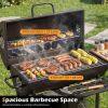 ● Diverse Storage Areas: Made for convenience, this outdoor charcoal grill includes a foldable front shelf, a foldable side shelf, and a large bottom shelf. These areas provide easy access to your barbecue tools and ingredients, keeping everything organized while you cook.