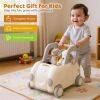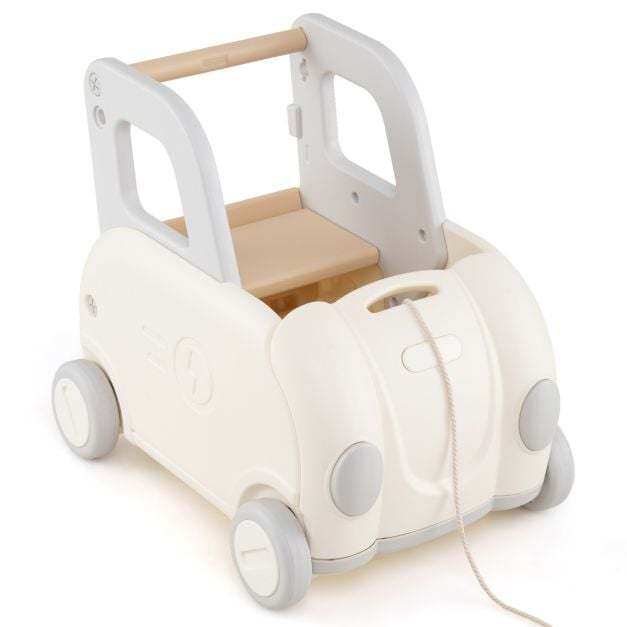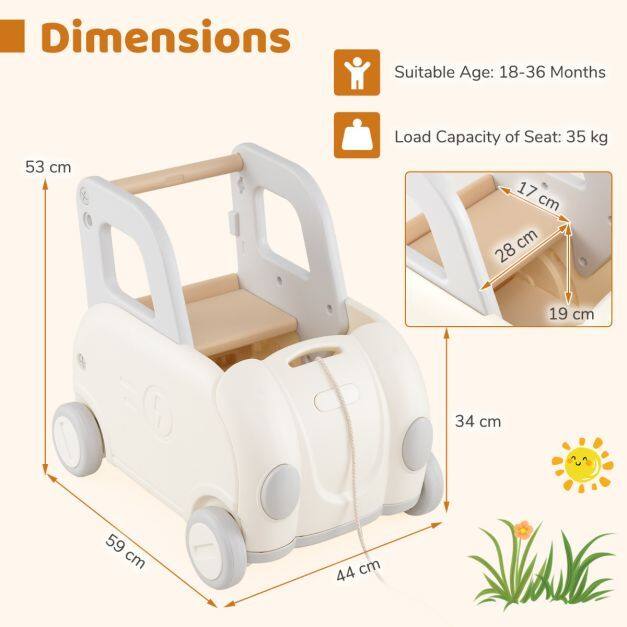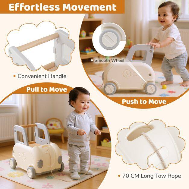 This versatile baby stroller is a fun and safe toy that offers parents and children a delightful play experience. It features a long pull rope for easy steering, a comfortable handle for stability, and a hidden storage compartment under the fold-down seat for toys and snacks. Its multifunctional design allows it to be used for walking, riding, towing, and as a storage basket. Push to move or pull to move, this walker is designed with multiple child-friendly features. It would make a perfect gift for children aged 18-36 months.