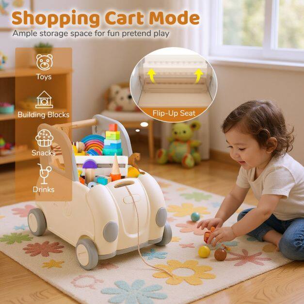 Extra Storage: The kids' shopping cart features a fold-down seat that conceals ample storage space. Perfect for holding toys, building blocks, or drinks, this cart also doubles as a fun, imaginative play shopping cart, encouraging creativity and interactive play among children.