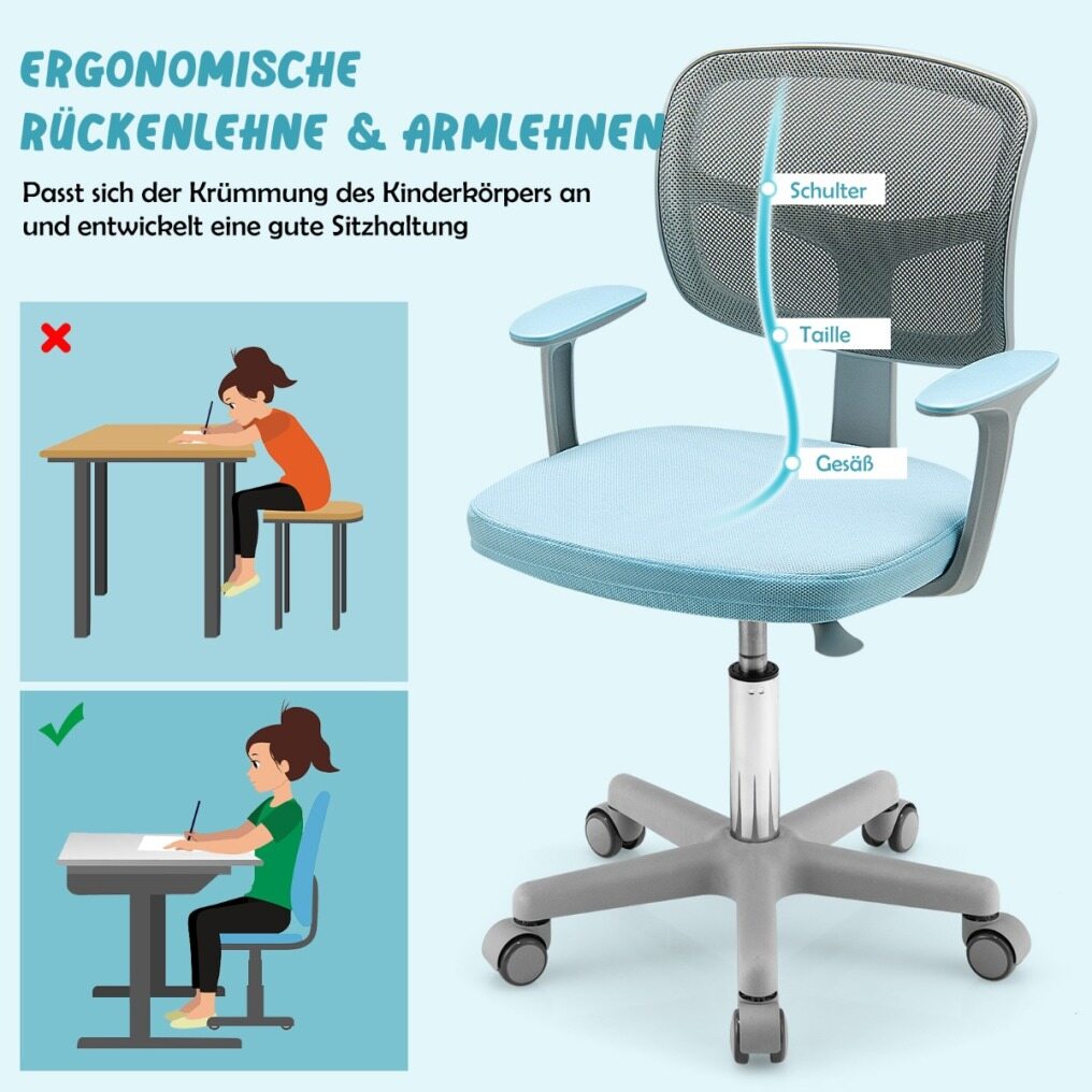 Ergonomic Design Urges Right Posture: This kids' task chair has a back with Y-shaped lumbar support and a deep seat to reduce the fatigue caused by long-hour sitting and studying. It also encourages the kids to form a right sitting posture. Besides, the armrests give extra support to the body.