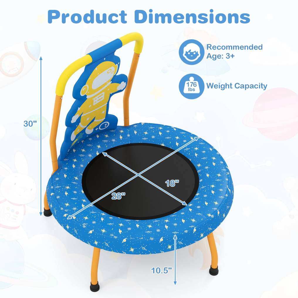 Robust & Stable Construction: Featuring a strong metal frame and non-slip feet, the small trampoline for kids indoor stays firmly in place during every leap and landing, supporting countless hours of active fun. The weight capacity is 50 kg.
