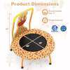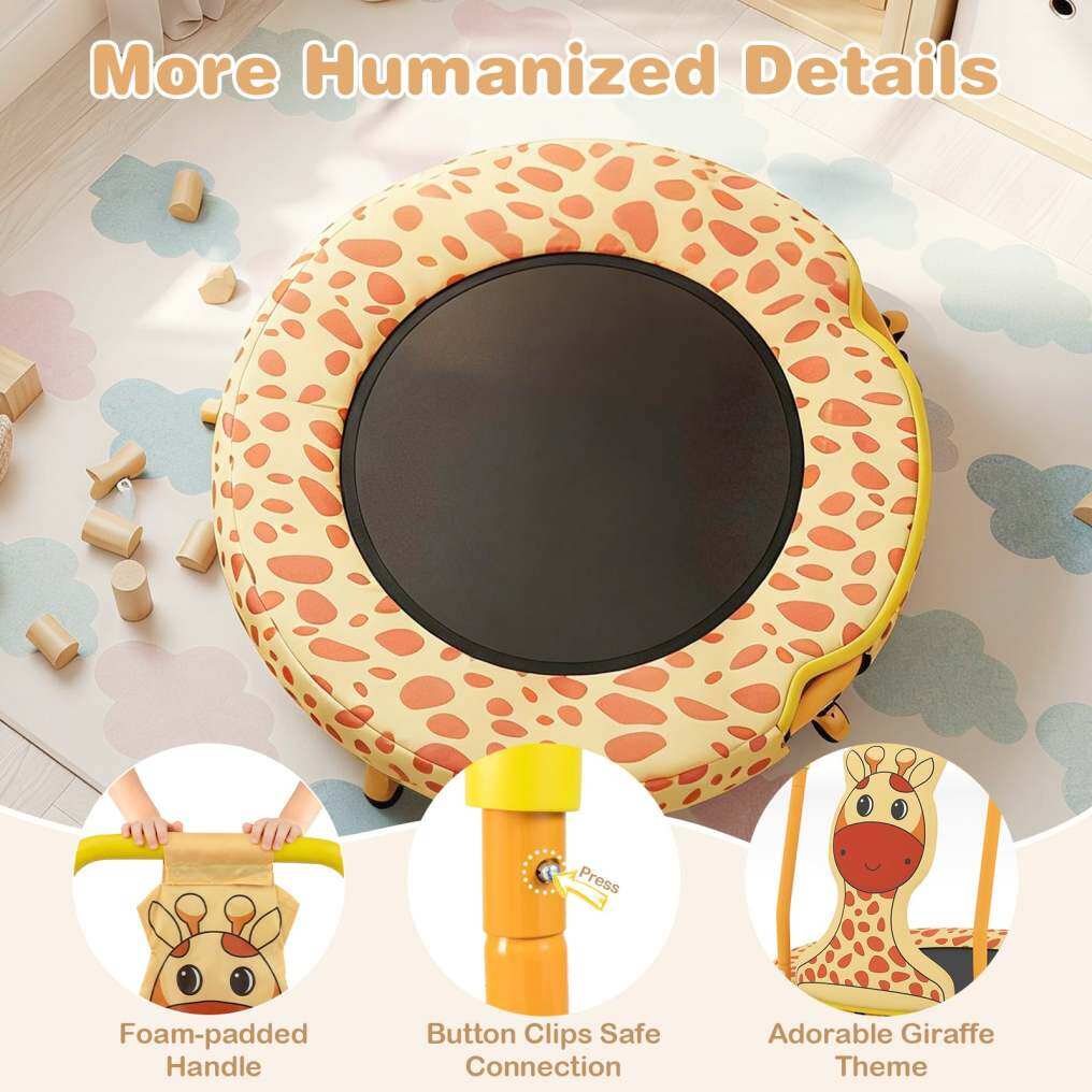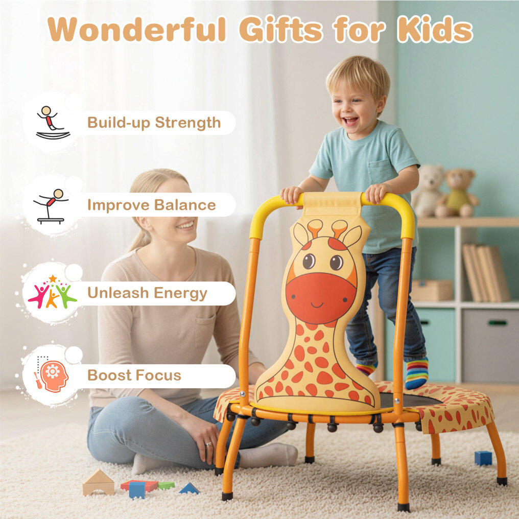 Wonderful Gift for Kids: With adorable giraffe/astronaut theme, the mini trampoline instantly captures the heart of any child, while its compact style complements playrooms and homes. Hence, it is an unforgettable gift choice for kids ages 3-6 with benefits for unleashing energy and improving balance.