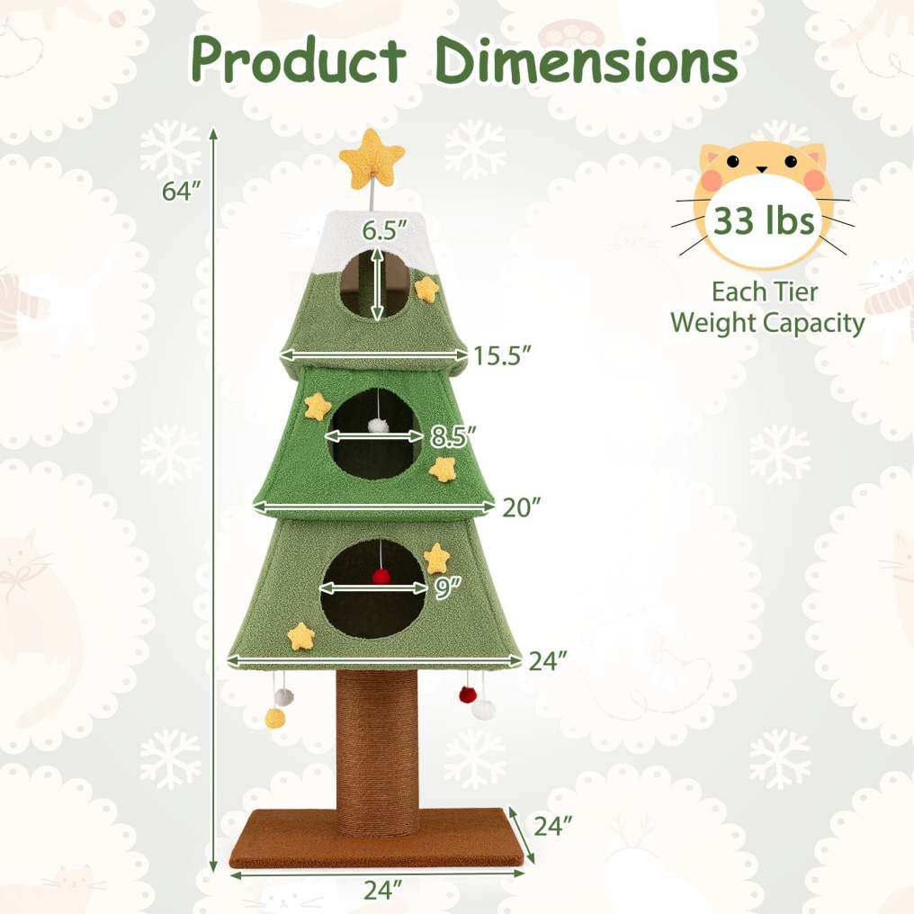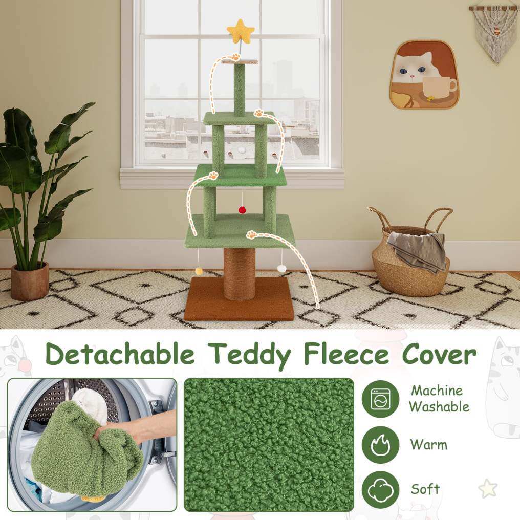 Designed with 3 spacious condos, the tall cat tower gives multiple cats their own private territory to rest and relax. Playful instincts are tamed with 2 dangling balls inside the condos and 4 interactive hanging pompoms that entice with their swinging motion. A sturdy, extra-thick sisal scratching post helps keep claws healthy while protecting your furniture from damage, and the wide base provides a stable construction during active play. The charming topper star spring toy encourages adventurous climbing. Plus, the Christmas tree themed cat climbing stand boasts decorative star-shaped Xmas balls to fill your space with seasonal cheer. For added convenience, the detachable teddy fleece cover is both cozy and machine washable, making maintenance simple. Hence, the delightful cat condo furniture is the perfect way to blend comfort, play, and festive style for your furry friends.