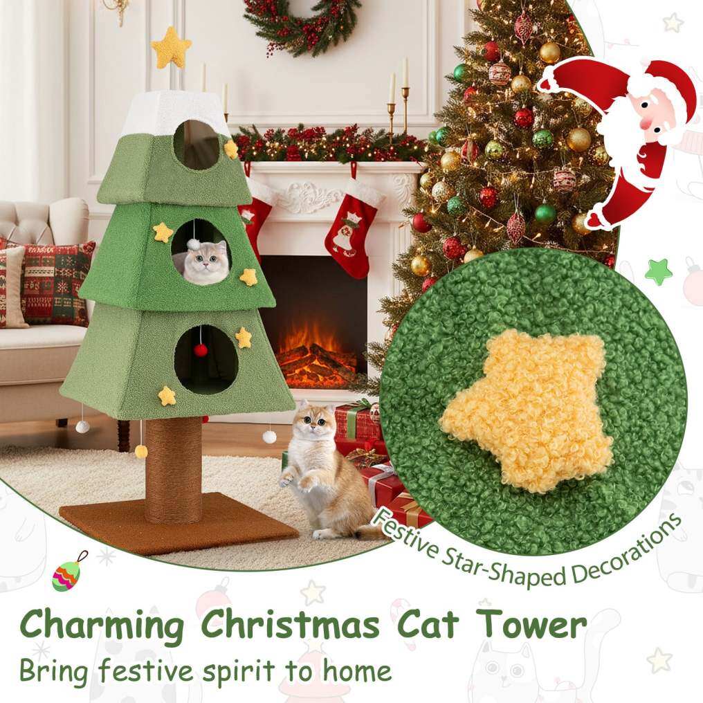 Charming Christmas Cat Tower: Crafted in the style of a Christmas tree, the cute cat tower serves as both a fun pet furniture piece and eye-catching seasonal decoration. Its vibrant festive colors and decorative details offer a whimsical alternative to standard Christmas decorations.