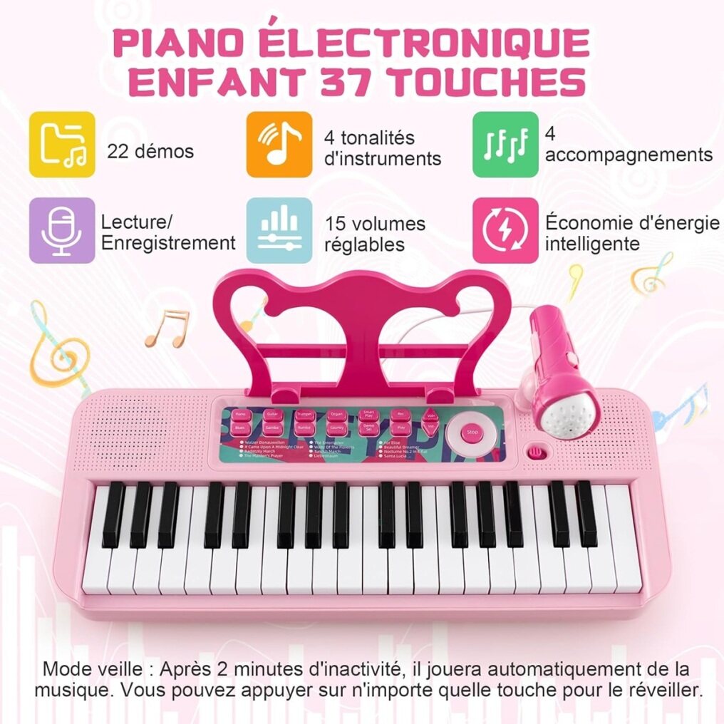 【Multifunctional Keyboard】This 37-key electronic piano for children offers a full range of musical features, including 22 demo songs, 4 instrument tones, 4 accompaniments, a play/record function, and 15 adjustable volume controls.