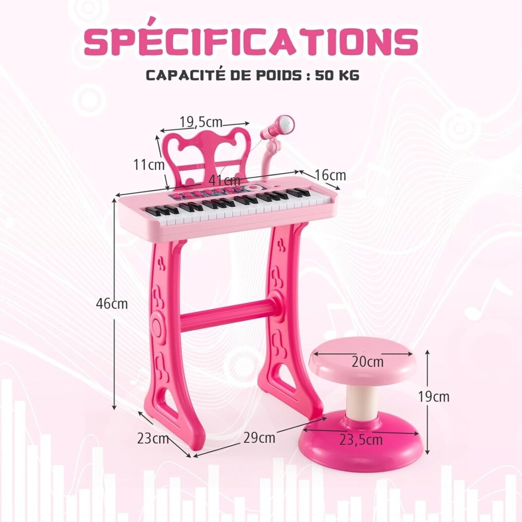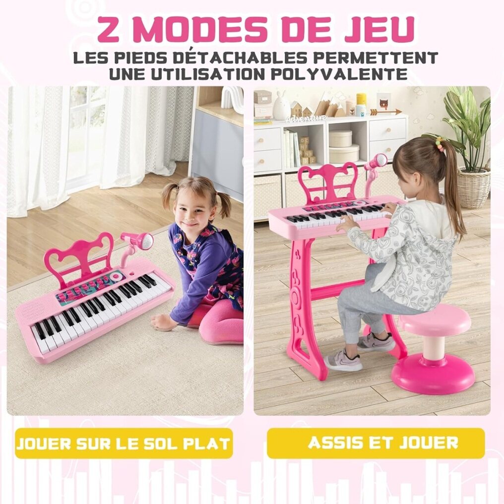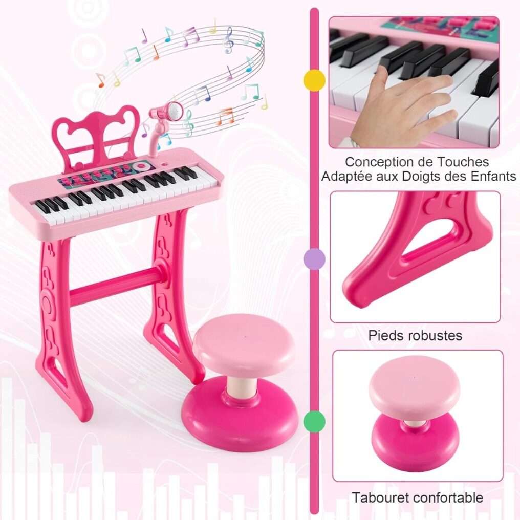 【Adjustable Microphone & Music Stand】The adjustable microphone adapts to children's different postures, including when singing while playing the piano. Additionally, this toy piano is equipped with a detachable music stand, allowing children to easily place their sheet music.