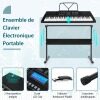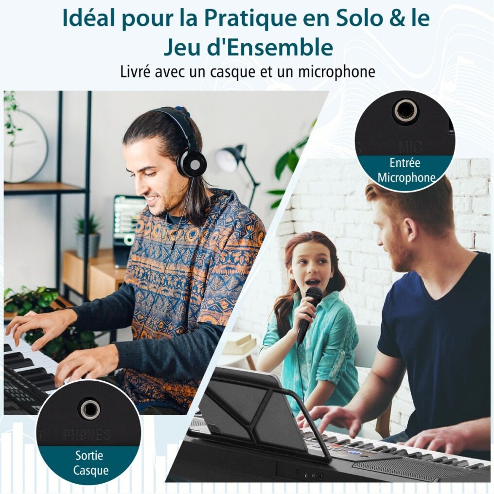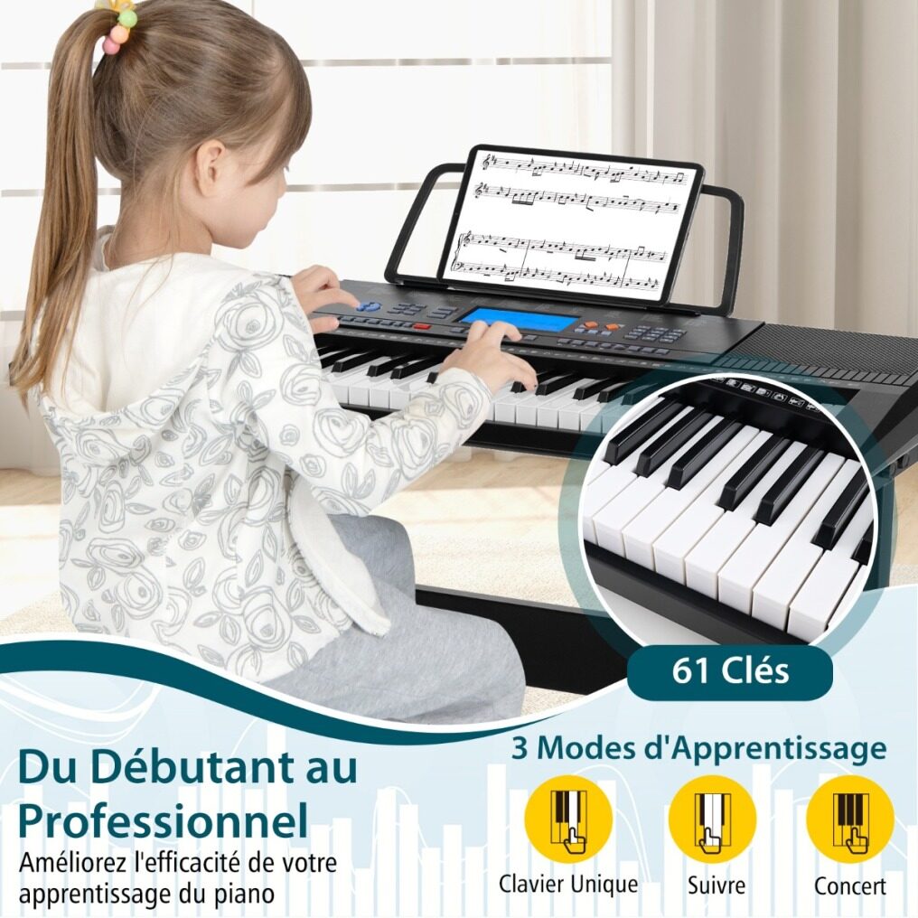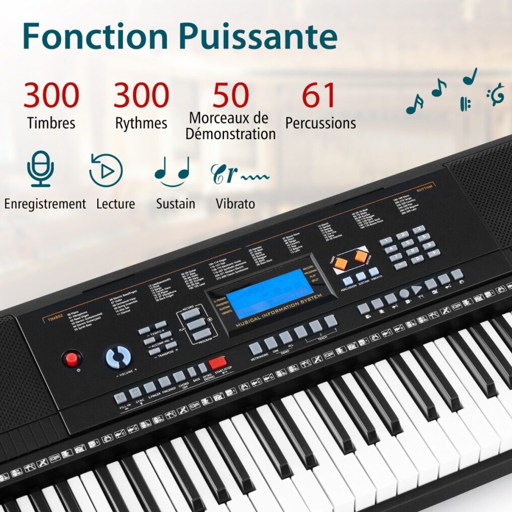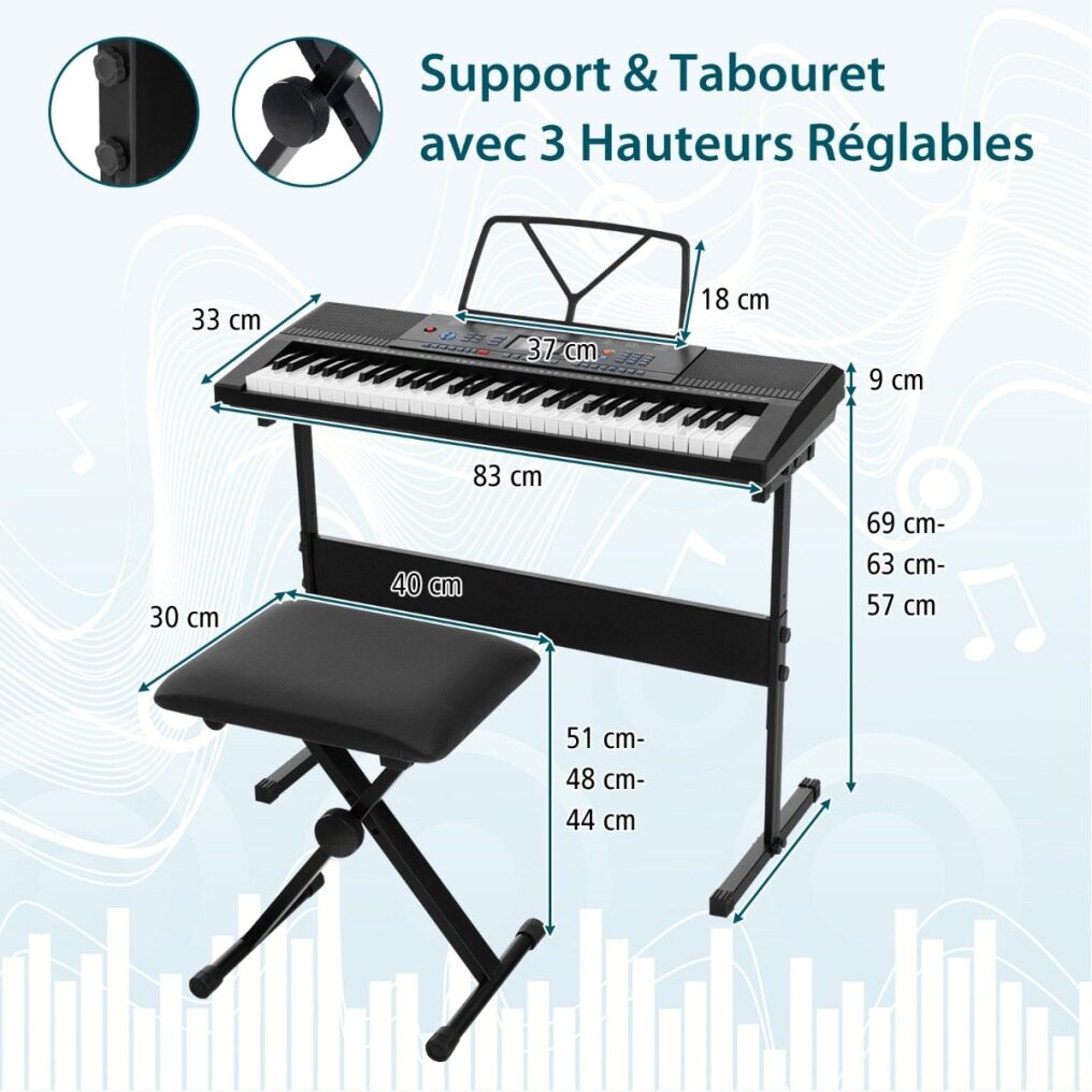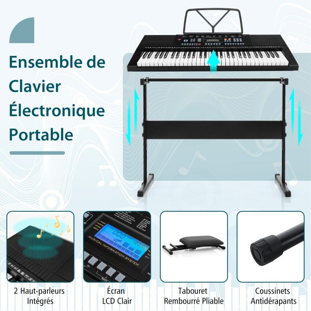 This set includes a 61-key digital keyboard, stand, stool, power adapter, headphones, microphone and music stand, ideal for beginners and experienced players alike. Designed for versatility, the height of the keyboard stand and stool can be adjusted to 3 levels for optimal comfort and posture while playing. The keyboard offers a multitude of options to develop your musical creativity: 300 timbres, 300 rhythms, 50 demos and 61 percussions. There are 3 teaching modes to enhance learning.