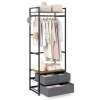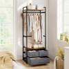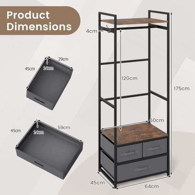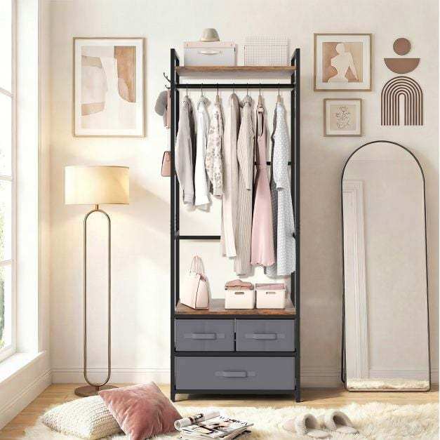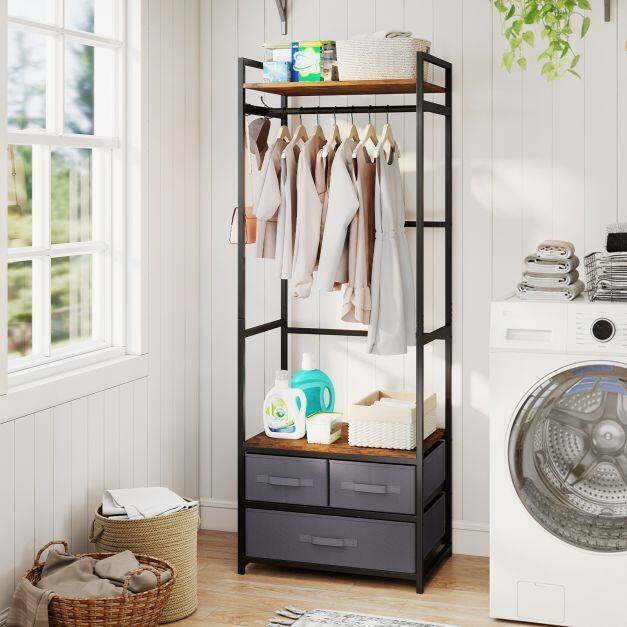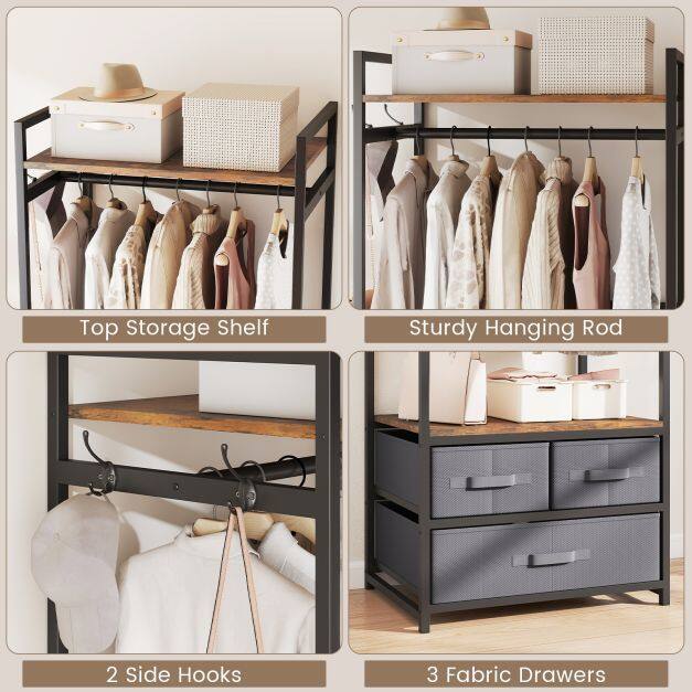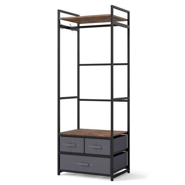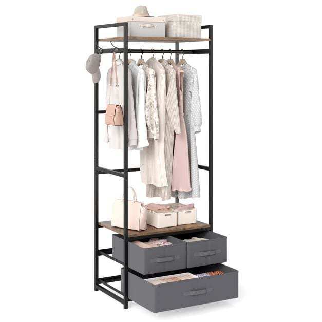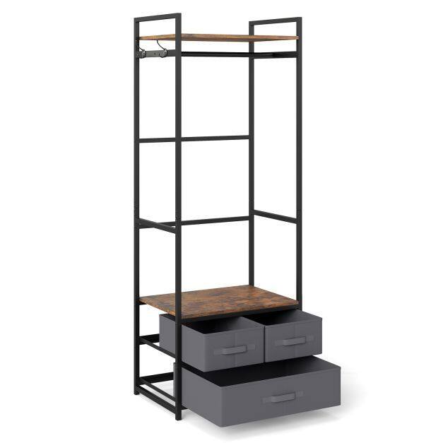 This clothes hanger features a heavy-duty metal frame that offers stable and reliable support, while 2 anti-toppling devices enhance safety. The rustic brown shelves paired with a black metal frame bring an industrial charm that complements various home decorations. For additional organization, the clothes stand includes 3 fabric drawers that provide enclosed storage. With its combination of a top shelf, sturdy hanging rod, side hooks and open middle shelf, this wooden clothes rack maximizes ample vertical storage space in entryways, bedrooms or wardrobes.