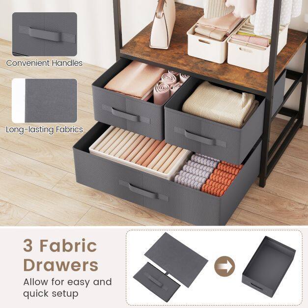 Convenient Fabric Drawer: Equipped with 3 fabric drawers (2 small and 1 large), this wooden clothes rack offers enclosed storage to keep smaller belongings neat and out of sight. Plus, the fabric design ensures easy assembly.
