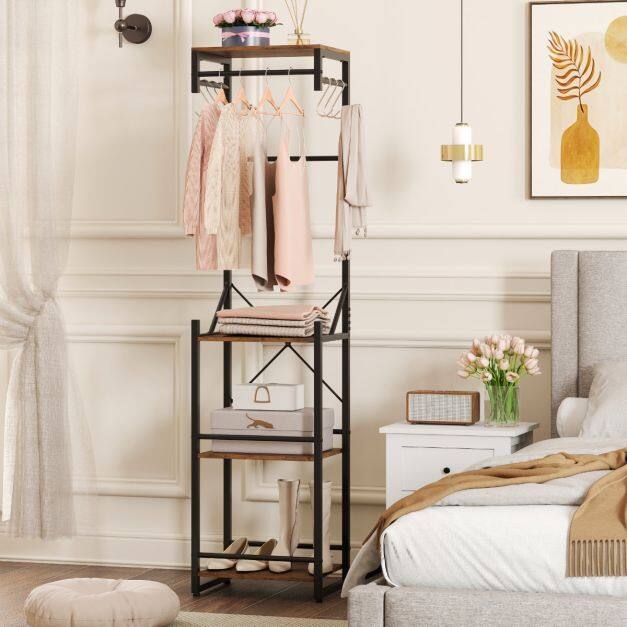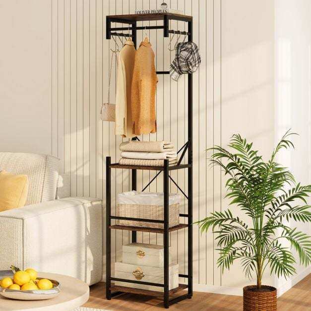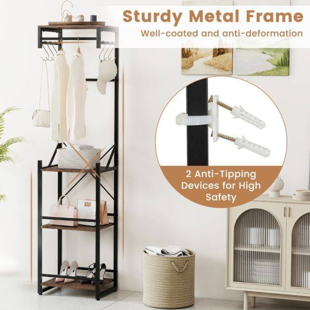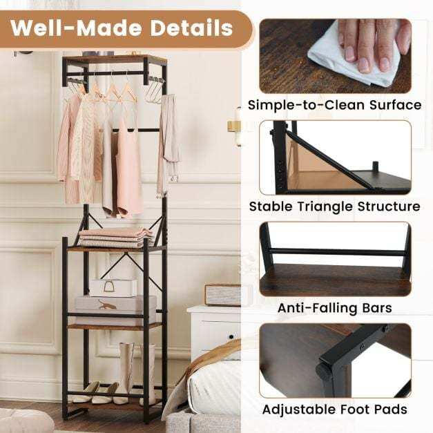 This industrial clothes stand offers a perfect blend of style and functionality, featuring a sturdy metal frame reinforced by triangular supports and X-shaped crossbars. Including multiple storage options, the coat hanger stand keeps clothes and accessories neatly arranged. Enhanced safety comes from 2 anti-toppling devices and protective guardrails. Additionally, space efficiency is a highlight of this clothes tree stand, which fits seamlessly into entryways, bedrooms, or offices without taking up excessive floor area. Its industrial aesthetic complements a wide range of interior designs, infusing a timeless and sophisticated touch to your space.