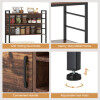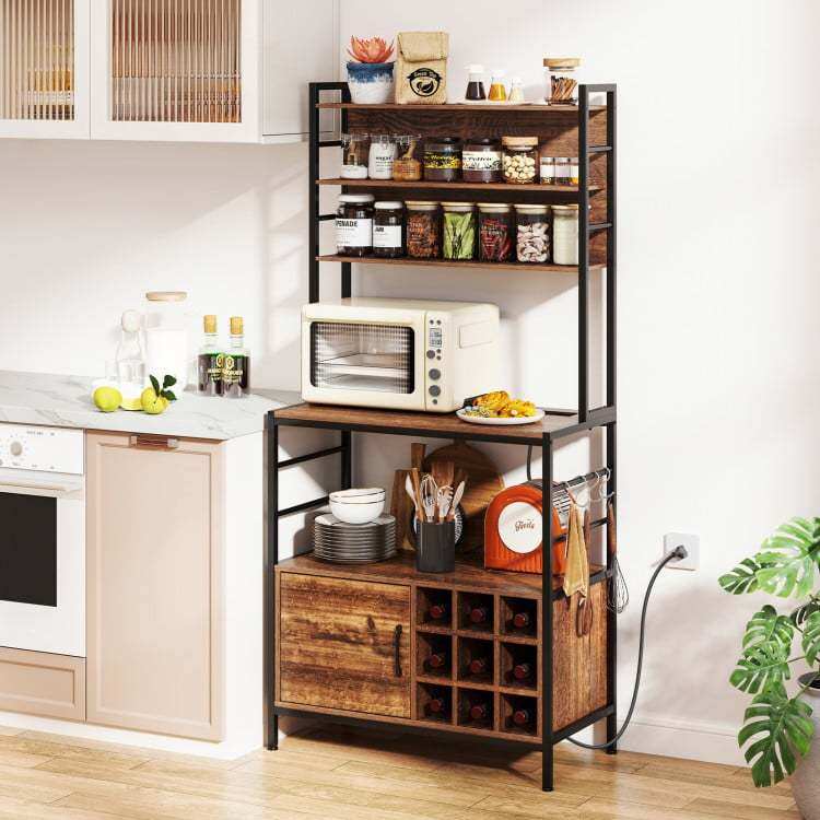 ● Spacious Storage Options: The microwave stand offers multiple open shelves, a cabinet with a door, hanging hooks, and wine bottle holders, providing ample space for cookware, tableware, and more with comprehensive organizational solutions.