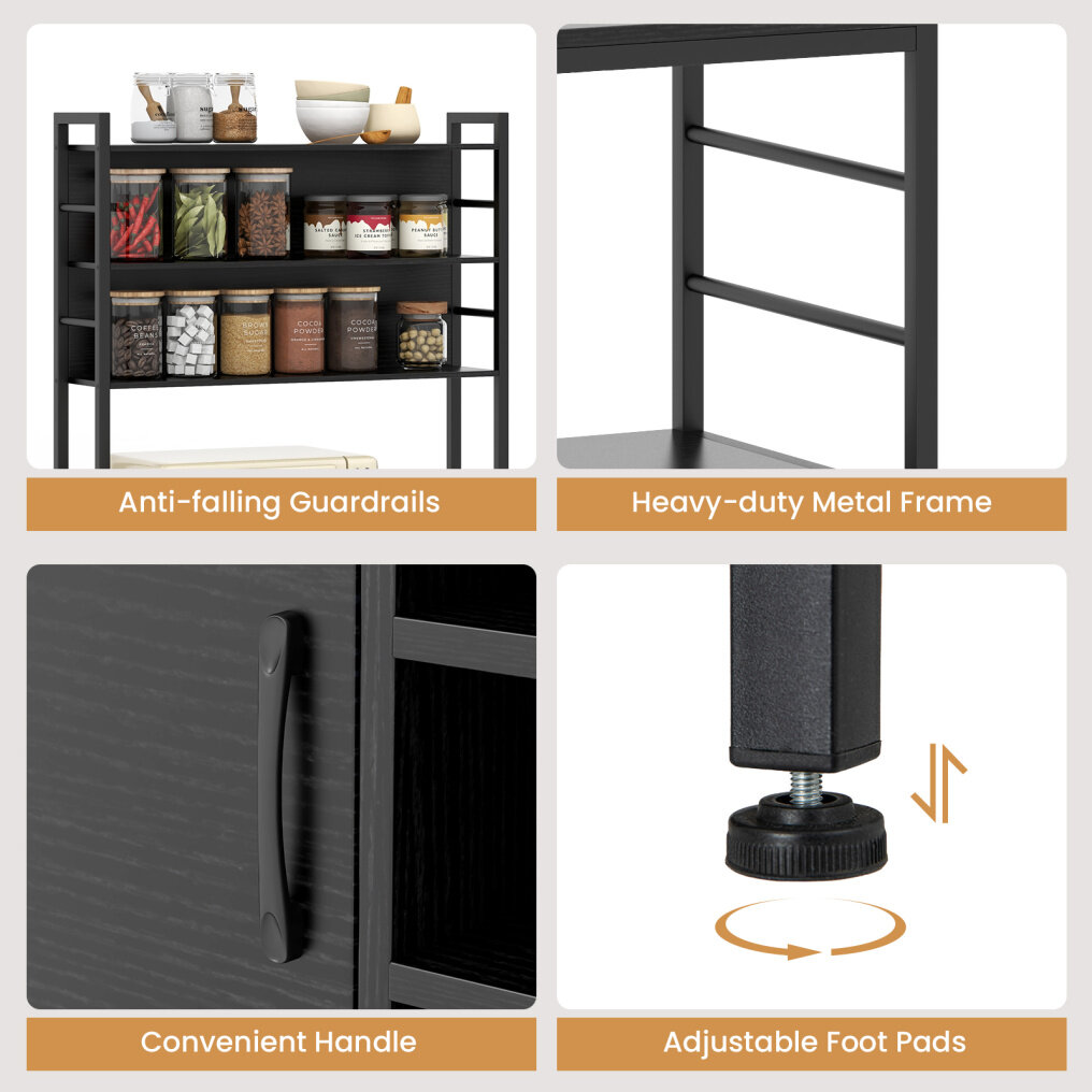 ● Designed for Stability: Supported by a sturdy and rustproof metal frame, this coffee bar cabinet boasts long-lasting durability and sturdiness. Additionally, the adjustable foot pads can adapt to uneven surfaces, making the kitchen storage rack more stable during use.