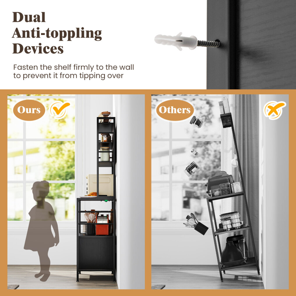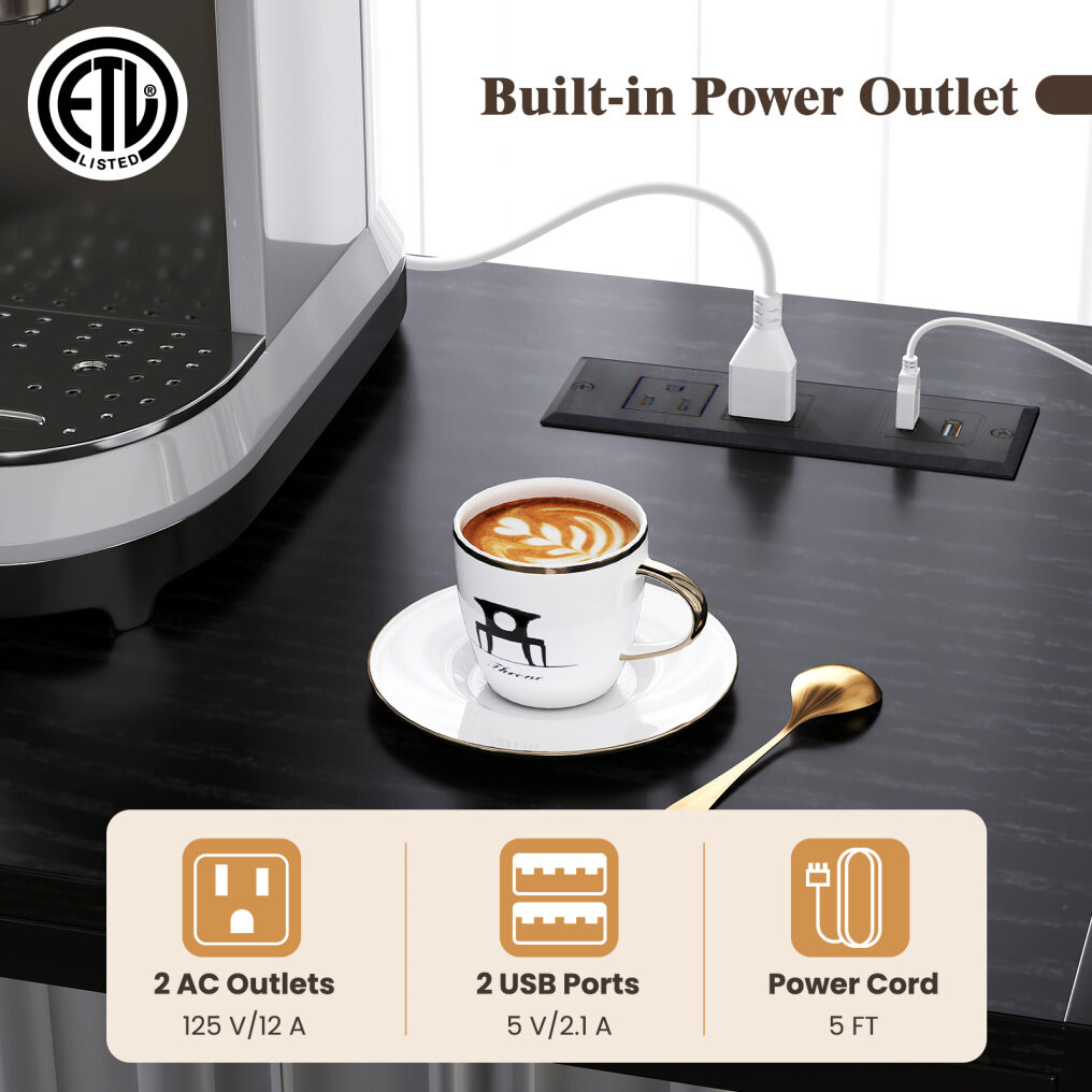 ● Built-in Power Outlet: Boasting an ETL certified power outlet, this kitchen bakers rack includes 2 AC outlets (125V/12A) and 2 USB ports (5V/2.1A), allowing you to conveniently charge devices and use electric appliances. The 5 ft power cord adds to the convenience of charging.