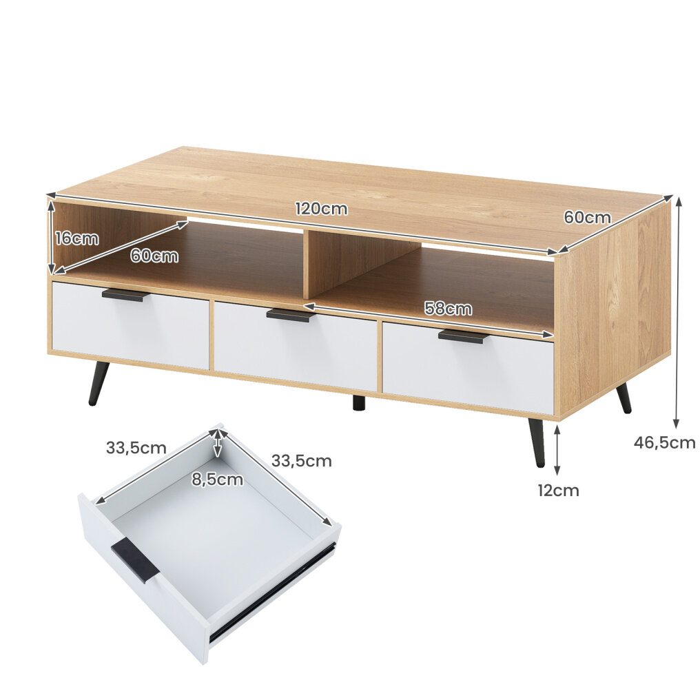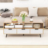 Designed with ample storage, it features a spacious tabletop, 2 open compartments, and 3 drawers to keep your essentials organized and within reach. The sturdy construction with thickened boards and 5 support legs ensures stability, while the raised design facilitates easy cleaning underneath. Enjoy the convenience of smooth metal slides on drawers and an easy-to-clean surface. Its exquisite wood texture and timeless design make it a versatile addition to any room, enhancing both functionality and style in your living environment. Perfect for storing essentials and enhancing your decoration, this coffee table is a must-have for a tidy and stylish home.