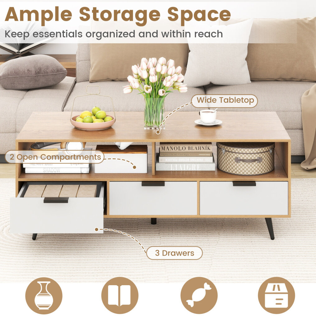 Ample Storage Space: This coffee table is designed to keep your essentials organized and easily accessible, featuring a spacious tabletop, 2 open compartments, and 3 drawers. It's ideal for storing books, snacks, vases and other items.