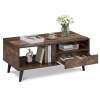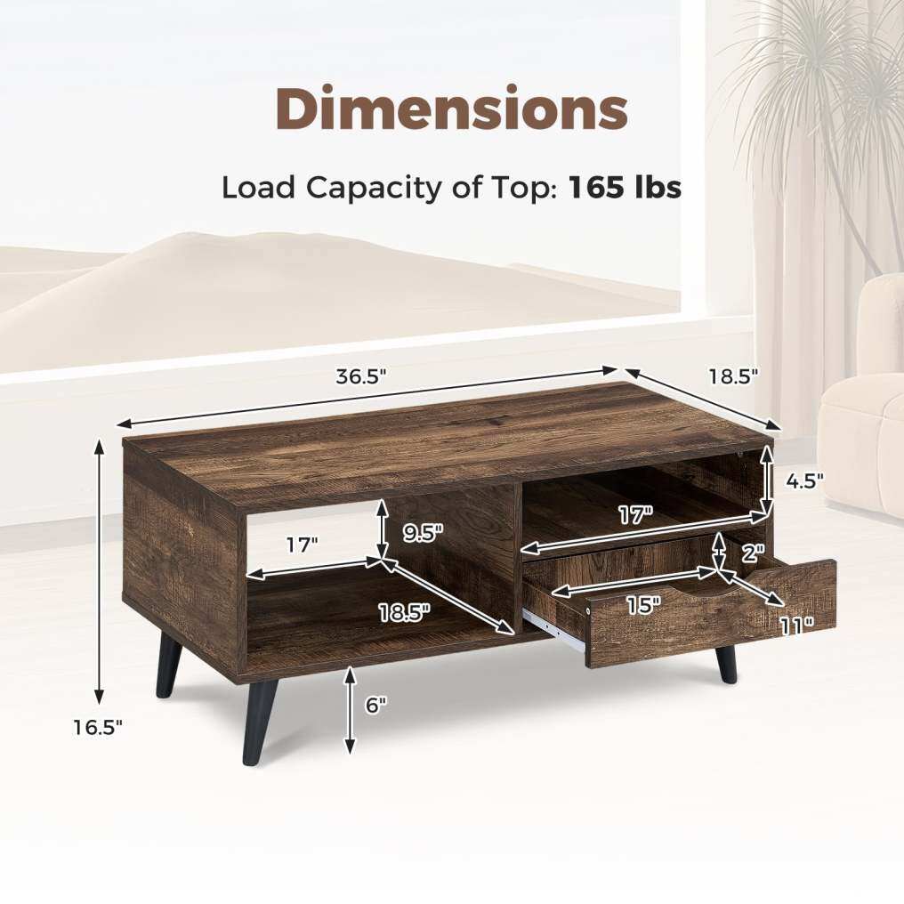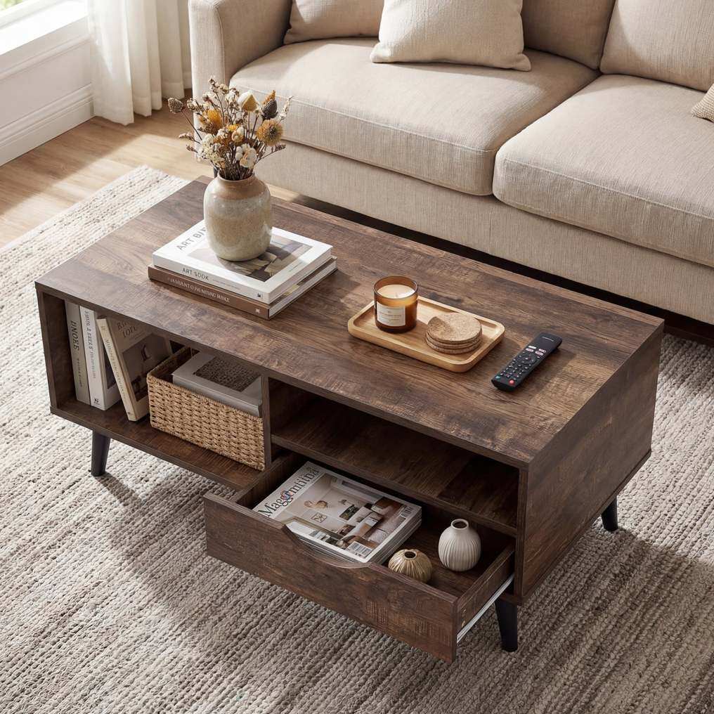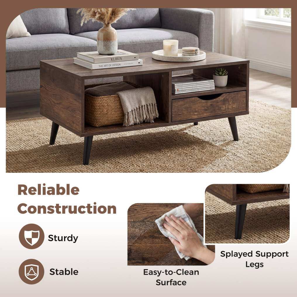 ● Stylish Storage Solution: The coffee table features a spacious tabletop, open shelves, and convenient drawer, offering ample room for books, remote controls, snacks, drinks, potted plants, and more.