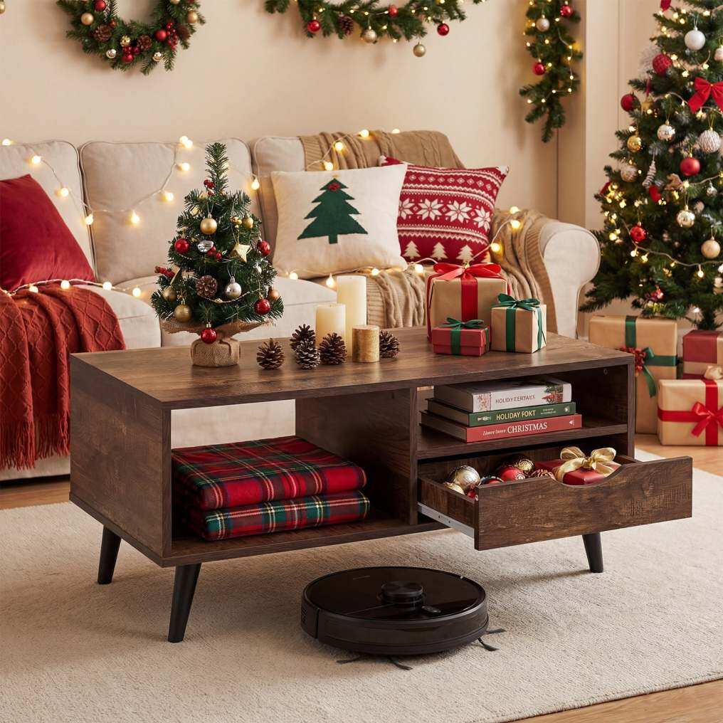 ● Premium Details: Discover thoughtful craftsmanship with sleek cutout handles that provide easy access to the drawer, paired with metal slides for smooth operation. The rectangle coffee table comes with a splinter-free surface for easy maintenance.