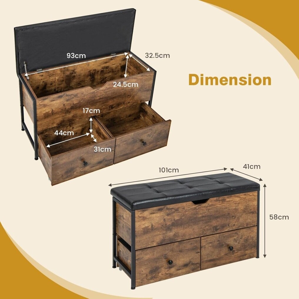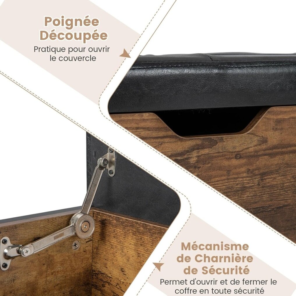 【STABLE AND SAFE DESIGN】Made of a sturdy metal frame, thick solid wood, and adjustable legs, the entryway bench is both sturdy and stable. The top lid features an opening handle and a high-quality hinge mechanism, which can be opened easily and will not produce a snapping sound when closed.