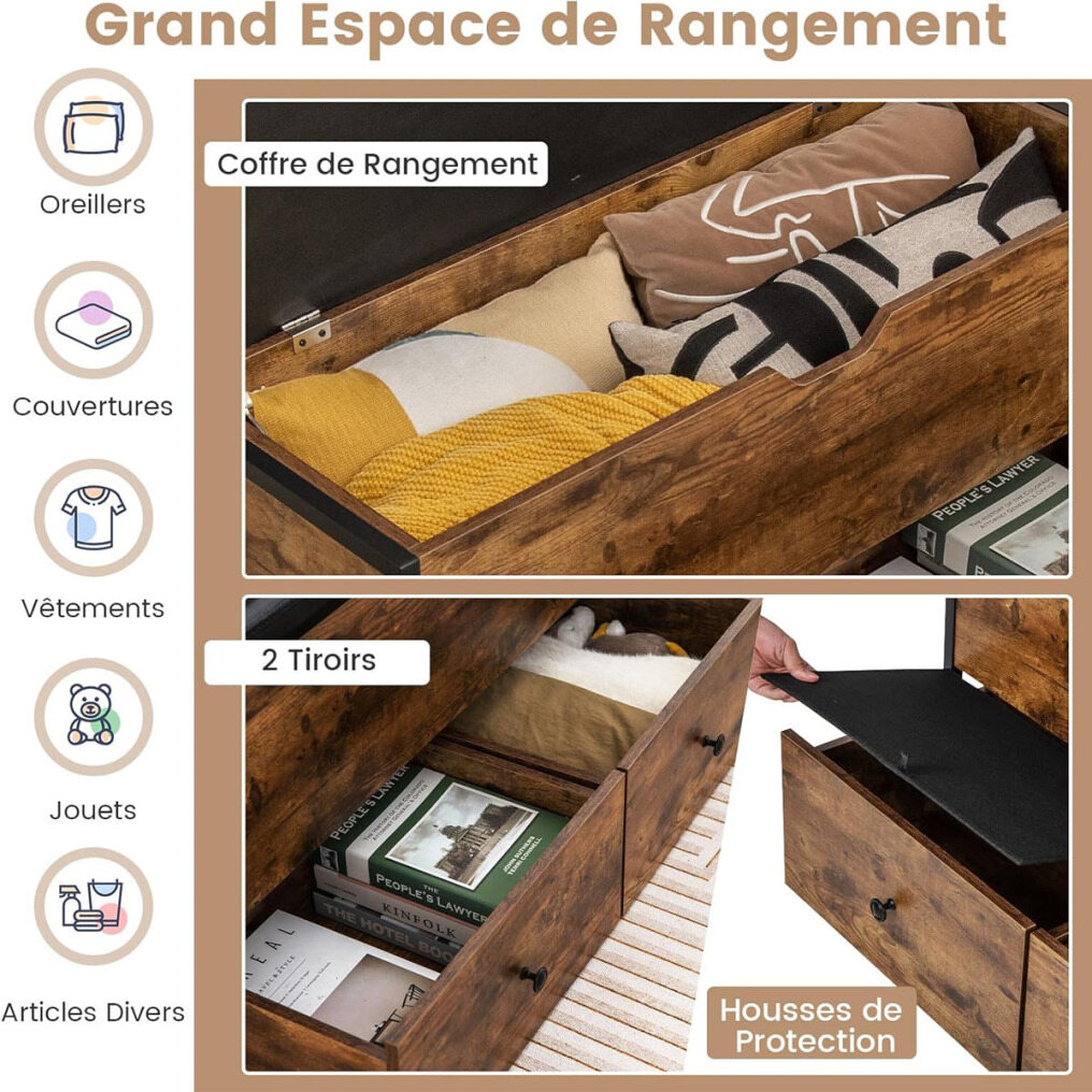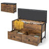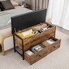 Need a versatile piece of furniture that combines seating and storage? Look no further than the Storage Ottoman Bench with Drawers! This wooden storage chest offers a generous storage compartment under the lid and two spacious drawers at the bottom. You can easily store clothes, pillows, sheets, blankets, or toys, for a clutter-free space. If necessary, the two drawers on casters can be completely pulled out to create more space for placing shoes. When changing shoes, you can sit comfortably on the padded cushion. The industrial storage chest adds a touch of elegance that blends perfectly into any space, whether it's the entryway, bedroom, living room, or other areas.