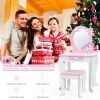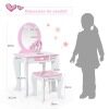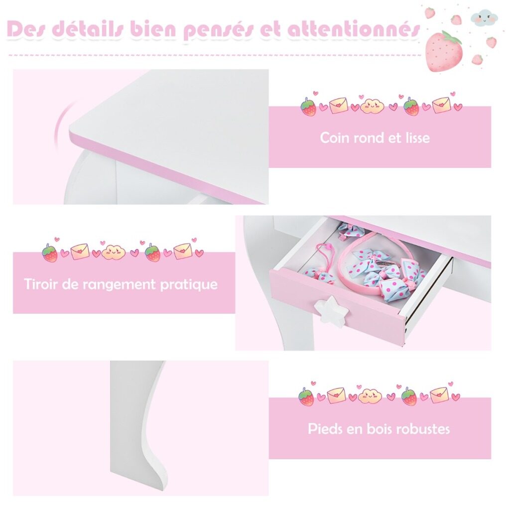 Featuring a clear mirror, this children's dressing table and stool set decorated with cute patterns helps your daughter realize her princess dream so that she can put on makeup and dress up. You can also remove the top if your children need to devote themselves to drawing or writing. After finishing makeup or studying, a practical drawer provides enough space to store your little girl's things so that the table top remains clean and tidy. For the safety of your children, this quality set is designed with rounded edges and an anti-tilt device. In order to quickly offer this perfect gift to your little princess, an instruction manual will help you assemble it. The smooth surface can be cleaned with a damp cloth for more comfort.