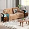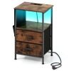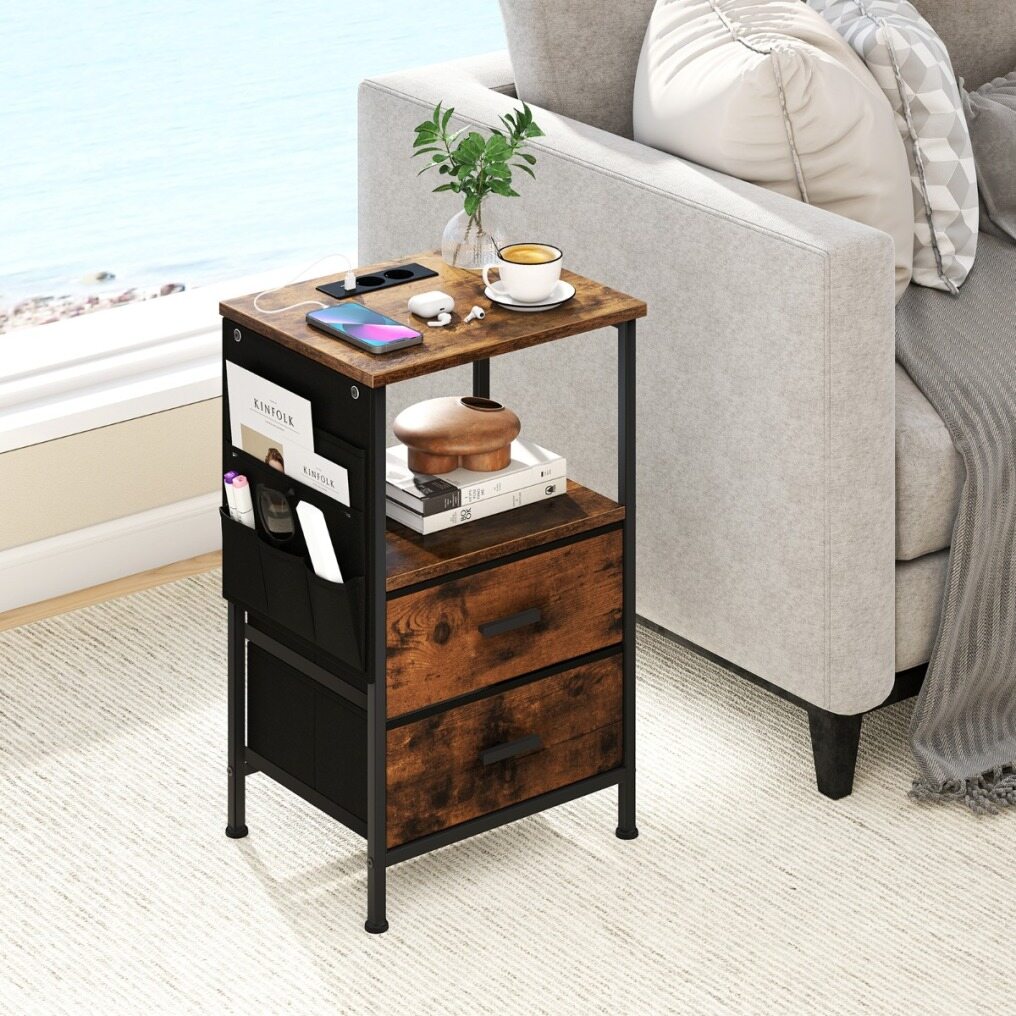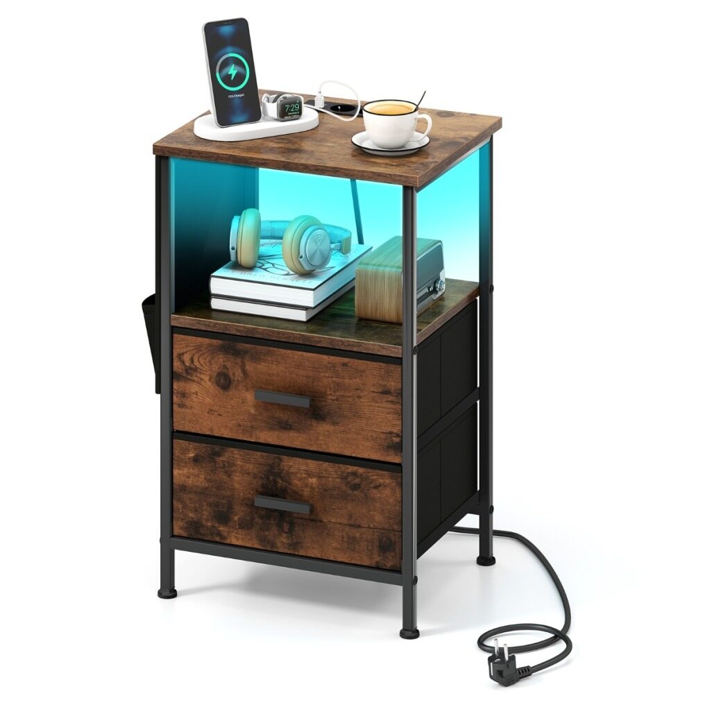Designed with your needs in mind, this sleek and modern bedside table features a 4-port charging station to charge all your devices. And that's not all! This nightstand is also a storage powerhouse, with a spacious top, an open shelf, 2 spacious drawers, and 6 side pockets. Finally, you can keep all your essentials organized and within reach. Crafted with attention to detail, our nightstand exudes rustic elegance. Its warm wood grain complements the matte black frame, adding a touch of sophistication to any decor. Plus, it's built to last with a sturdy metal frame, featuring adjustable feet for added stability.
