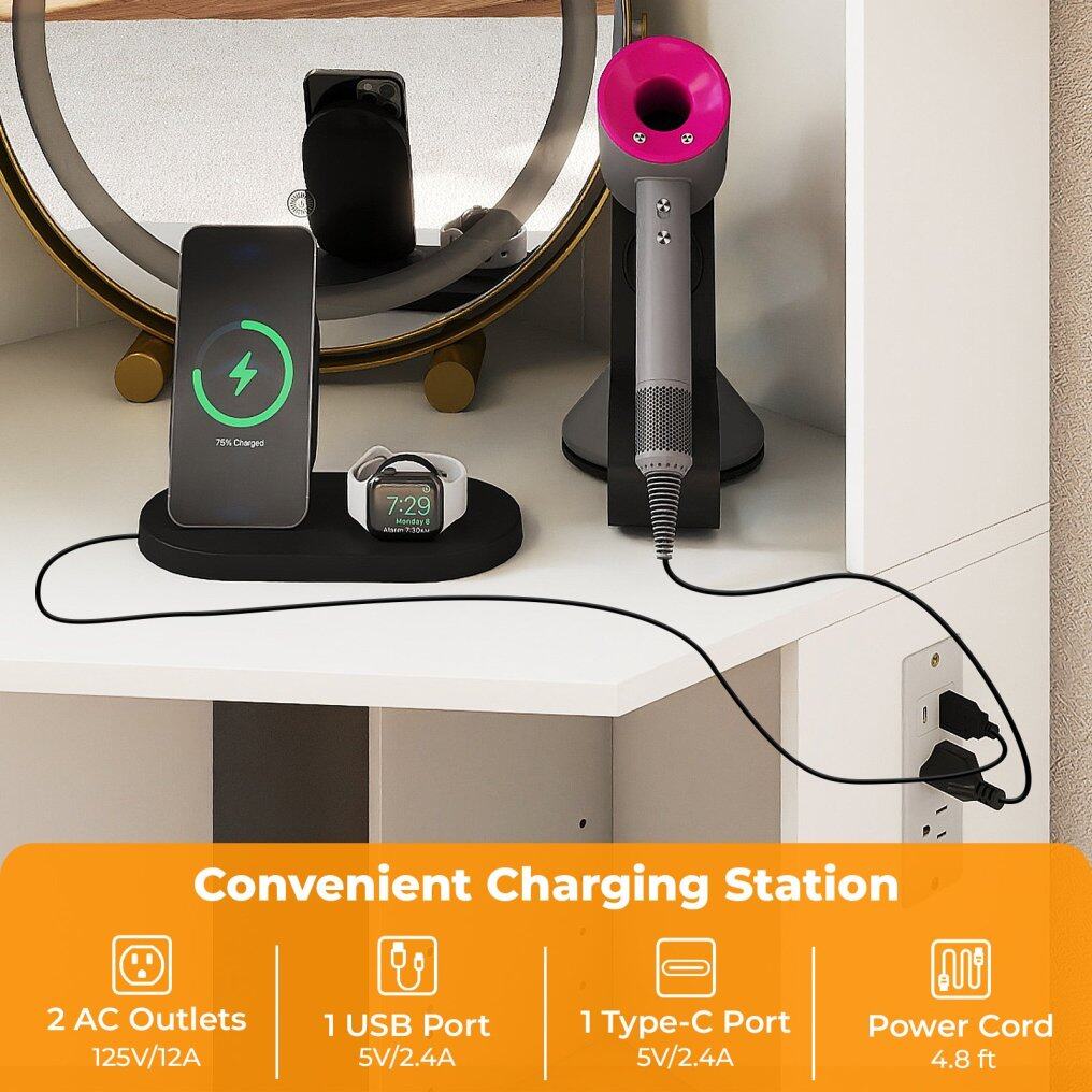 ● Convenient Charging Station: This makeup table features built-in power outlets (2 x 125V/12A AC outlets, 1 x 5V/2.4A USB port, and 1 x 5V/2.4A Type-C port), keeping your devices powered and ready while you get ready.