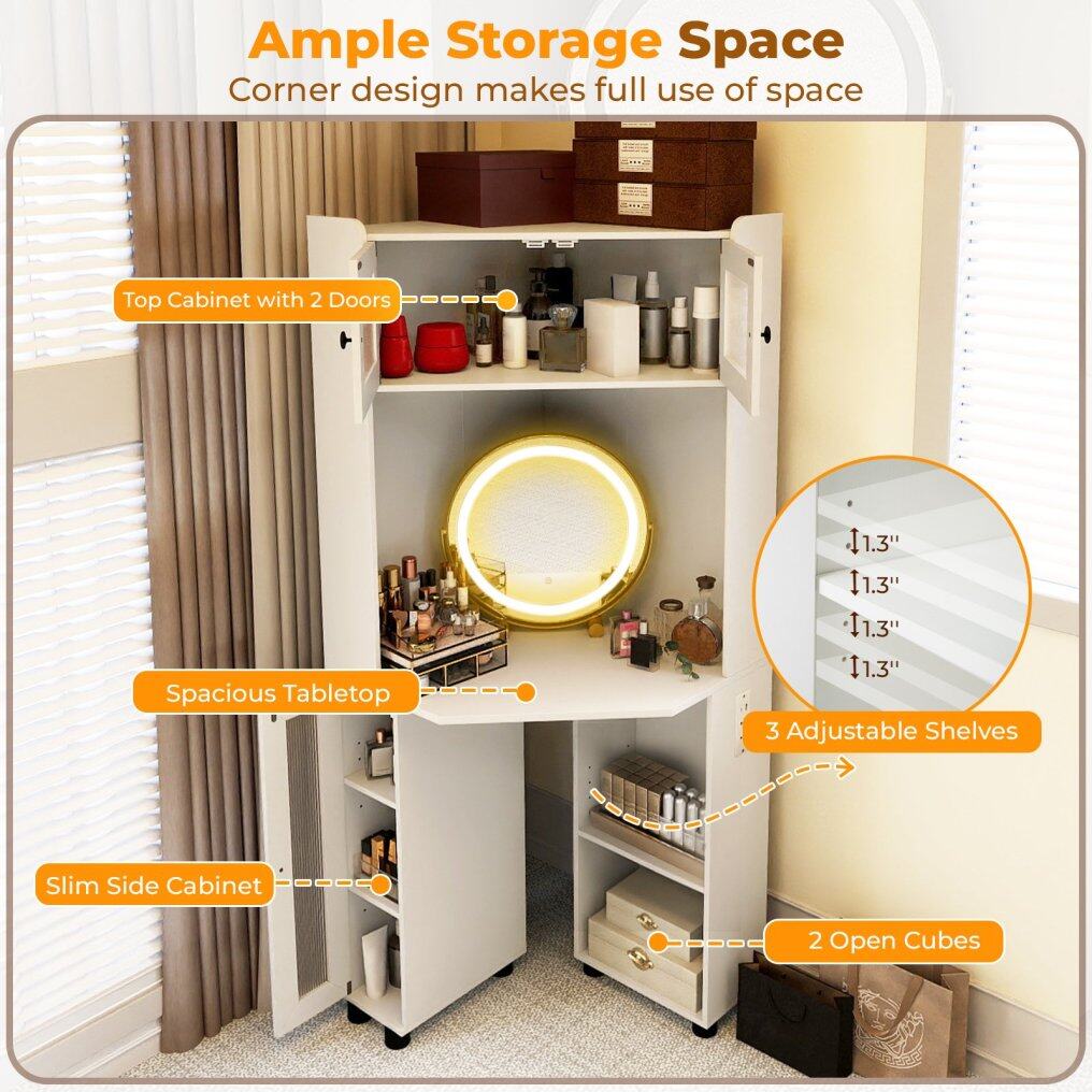 ● Safe and Sturdy Construction: With 2 anti-toppling devices provided, this corner dressing table can be anchored to the wall firmly for enhanced security. The cabinet doors with magnetic catches keep your belongings safe, and the anti-slip feet ensure your vanity standing strong for years of use.