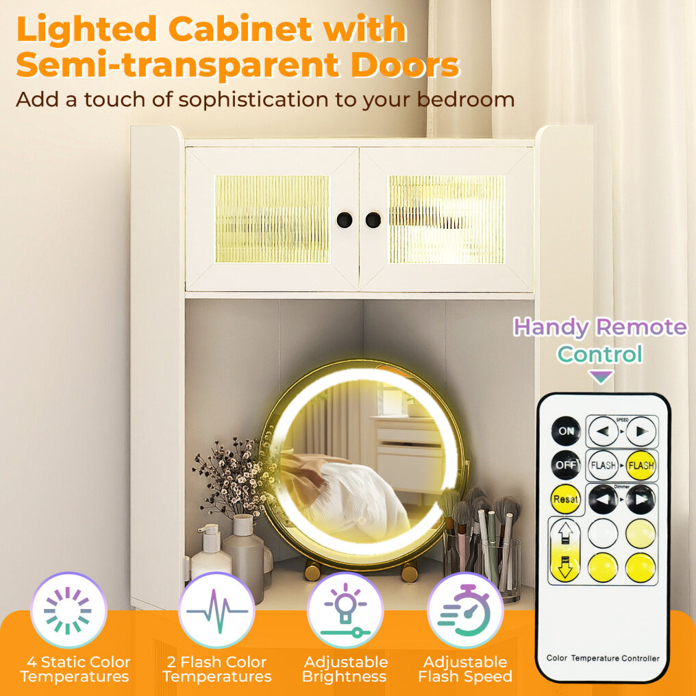 ● Luxurious and Comfortable Design: The lighted cabinet with semi-transparent doors adds a touch of sophistication to your bedroom. The included handy remote control allows you to easily control the lights, including 4 static color temperatures, 2 flash color temperatures, adjustable brightness & flash speed. Besides, this vanity set comes with a soft cushioned stool for maximum comfort.