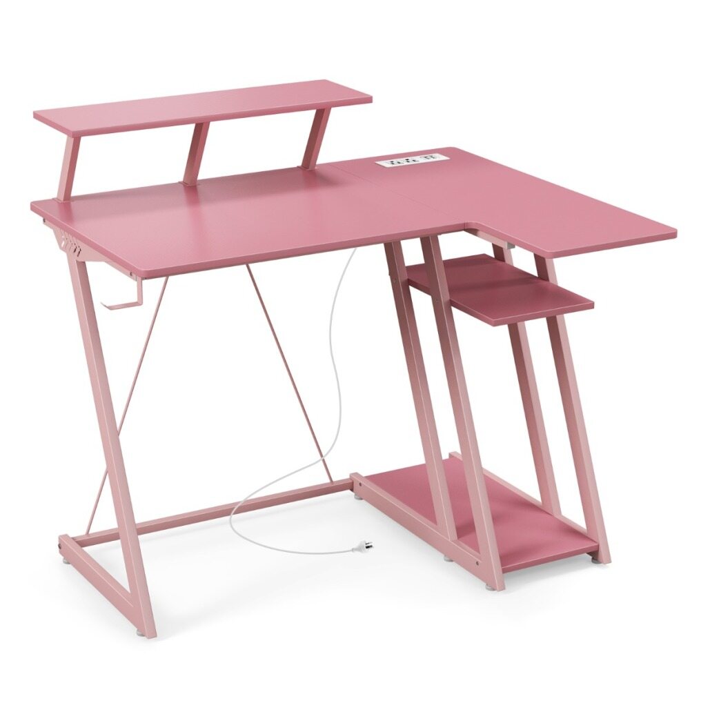 Upgrade your workspace with this innovative computer desk that combines functionality with convenience. Featuring a built-in charging station with 2 outlets and 2 USB ports, you can keep your devices powered up at all times. The reinforced Z-shaped structure as well as the adjustable foot pads ensure durability and balance. And the removable monitor stand allows for ergonomic viewing. Spacious desk top is large enough to accommodate your monitor and other office supplies, while the CPU stand and extra storage shelf provide independent space for all your essentials. Save space with the L-shaped design that fits perfectly in any corner. Adding style and practicality to your home office, this desk is a must-have for you.