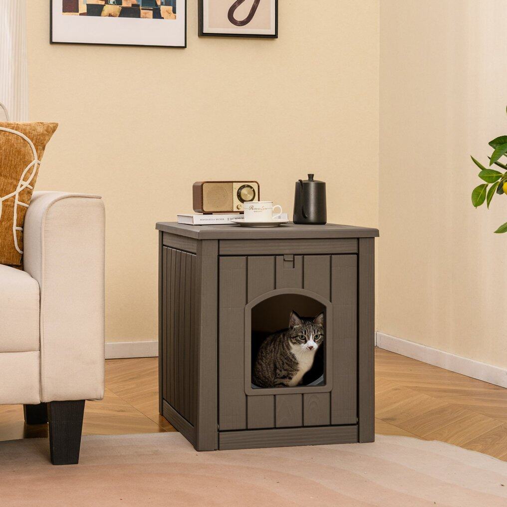 The multifunctional pet house can serve as a side table, bedside table, hidden litter box, or a cozy cat house. Its discreet design helps minimize litter and contain odors, contributing to a clean living space. Made of weather-resistant PP material, it is fade-resistant and colorfast. The front flap door opens easily, simplifying cleaning and changing the litter box.