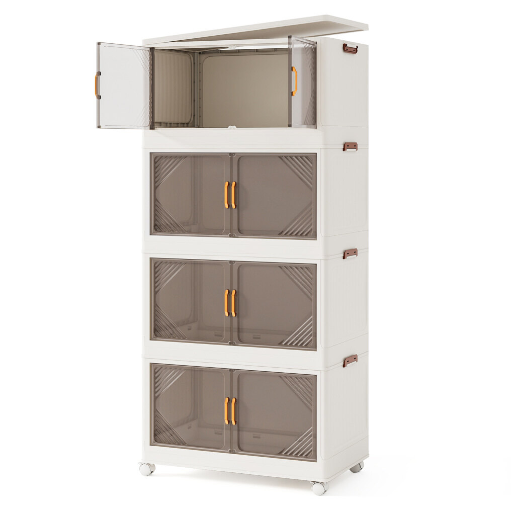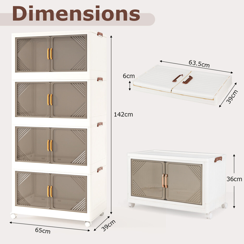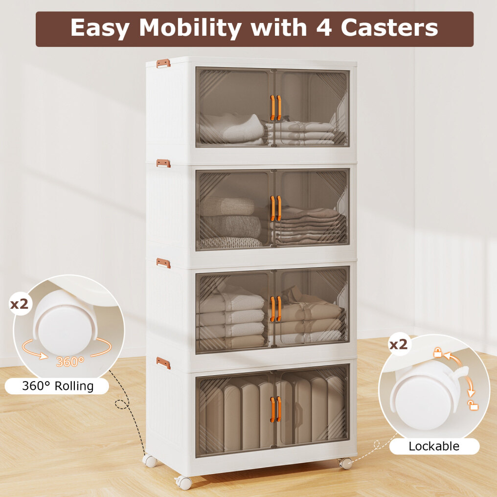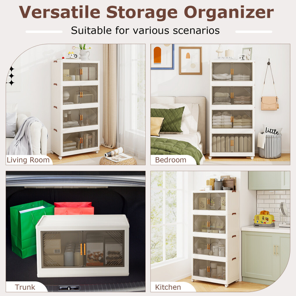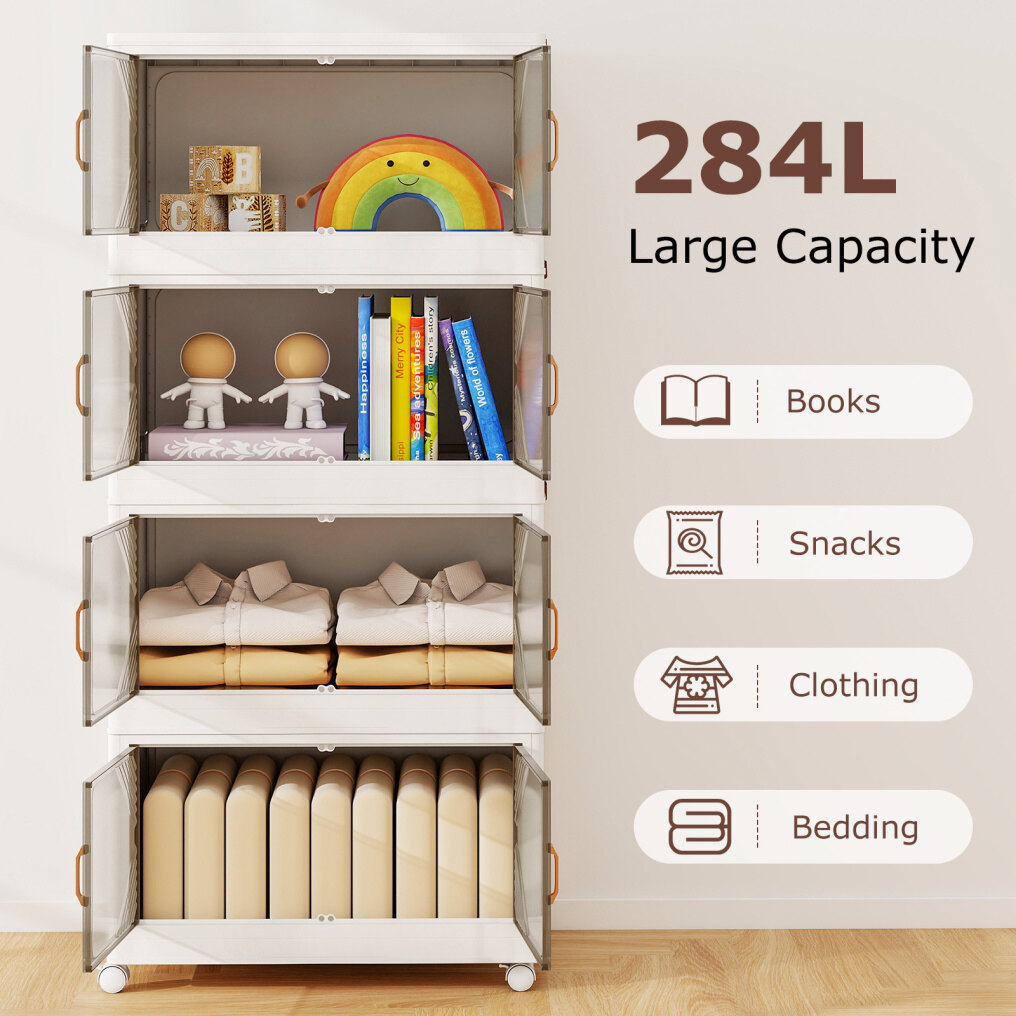 Transform clutter into elegance with our ultra-modern storage solution! Offering an astonishing 56/75 gallons of space spread over a 3/4-tier system, this organizer is a marvel for freeing up clutter and maximizing usable space. Chic and practical, it features an effortless fold-and-stack design, locking side buckles, and transparent doors that keep items visible and neatly arranged - perfect for the savvy organizer. Roll it smoothly on its 360° rolling casters or lock it in place. Whether you’re taming the chaos in your bedroom, living room, or pantry, this storage box is your secret weapon for maintaining a sleek, organized home. Dive into seamless organization - enhance your storage decoration today!