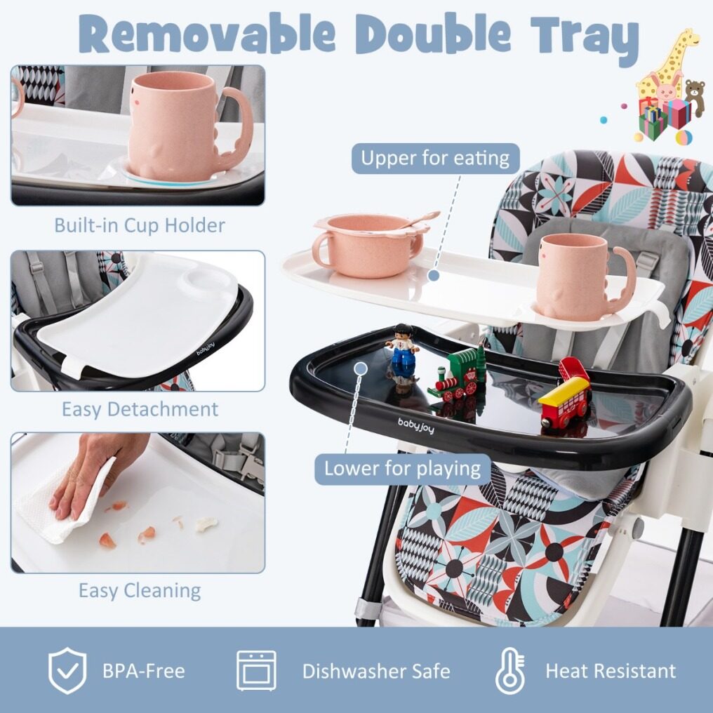 ● Detachable Double Tray: This foldable high chair comes with a 2-layer food tray, easy to take off. Therefore, parents can easily remove the food tray for cleaning after babies finish eating. The dinner tray is also dishwasher, convenient for daily use. Plus, the food tray can be fixed at rear legs of the chair when not in use.
