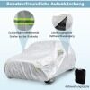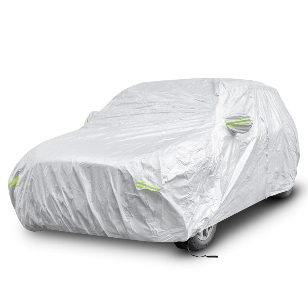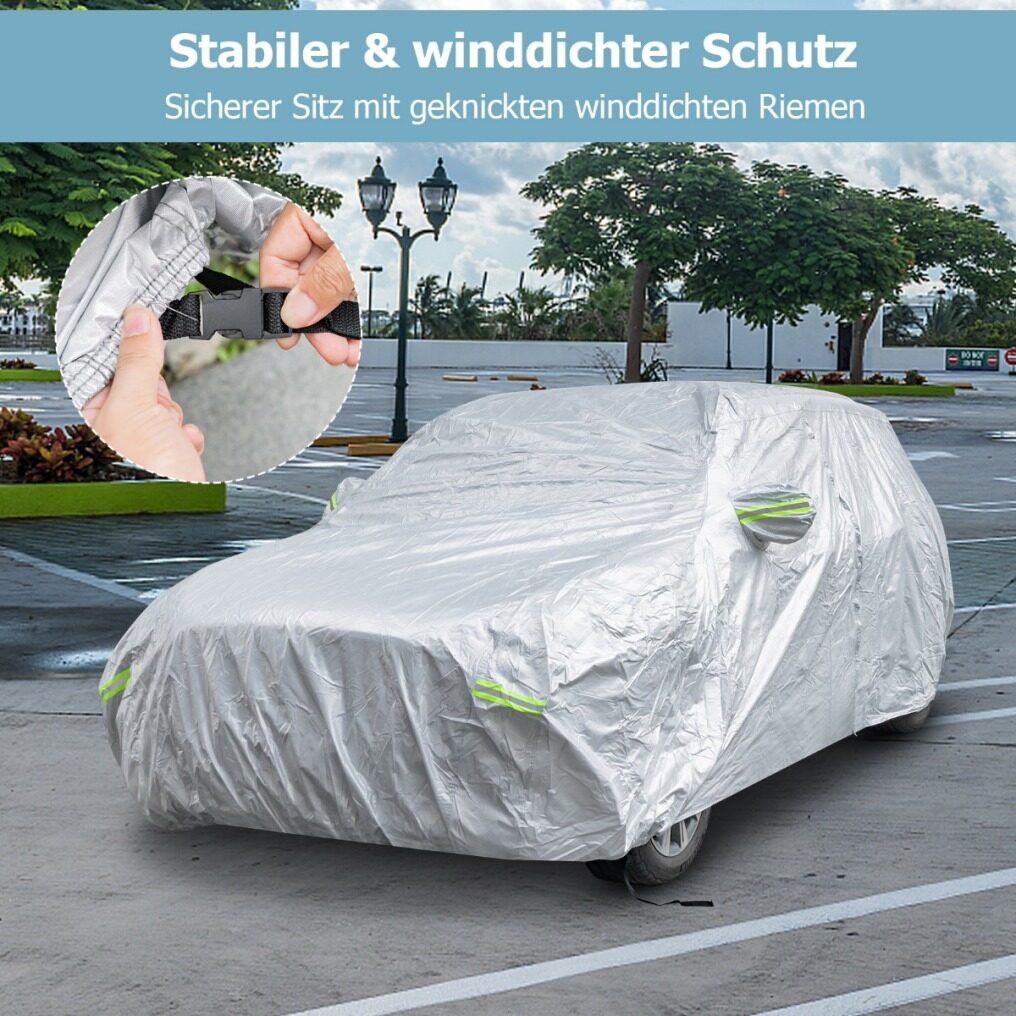 This vehicle cover is expertly crafted and features a three-layer construction including a high quality aluminum foil layer, a protective PE/EVA layer and a soft cotton lining. This combination of materials ensures unparalleled durability and reliable protection for your vehicle. In addition, with its advanced weather resistance design, this tarpaulin offers excellent UV resistance, rain resistance and snow resistance. It protects your vehicle in all weathers. For safety reasons, this car cover designed with thoughtful details features reflective strips on the back for better visibility, a rear view mirror cover for additional protection and a windproof strip with buckle to secure the cover securely and in a stable position. In addition, the practical zip door allows easy access to your vehicle. It's also really not difficult to use. Simply place the cover over your vehicle, adjust the elastic cord for a snug fit, insert the buckle tightly to increase stability, and adjust the strip for optimal coverage and protection.