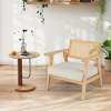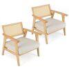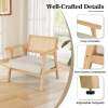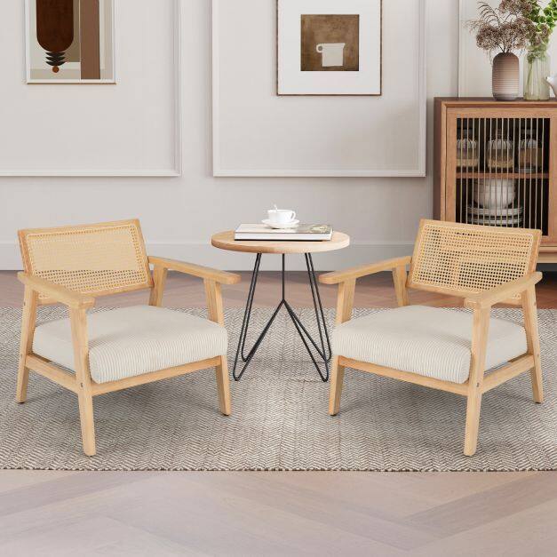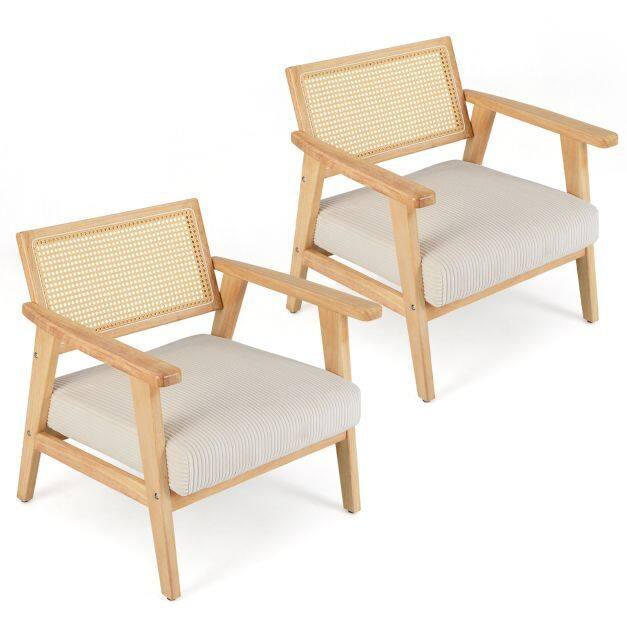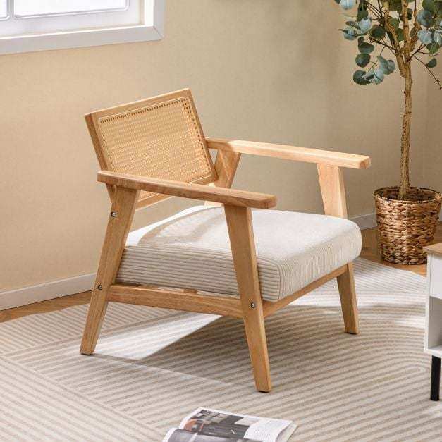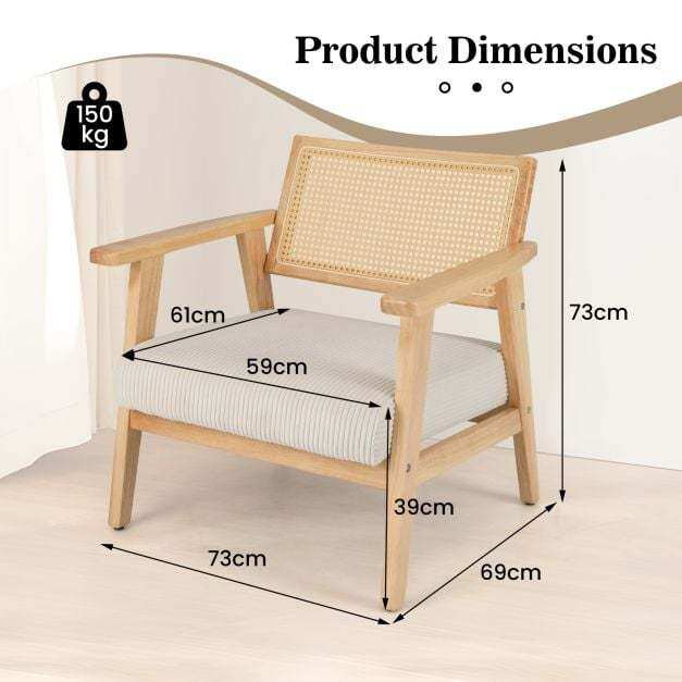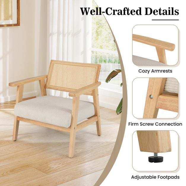 Boasting a robust rubber wood frame, this chair ensures stability and longevity, suitable for daily use. The padded seat is covered with soft corduroy fabric for supreme comfort, while the PE rattan back provides an elegant touch and added breathability. The mid-century design of the leisure chair effortlessly blends modern and classic aesthetics, making it a chic addition to any living room, bedroom, or study. Whether as a functional seating option or a decorative piece, this accent chair promises to elevate your indoor living space.
