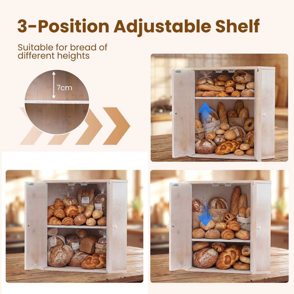 ● Double Layer Versatility: This corner bread box boasts a 2-tier design that optimizes your kitchen countertop storage. Featuring a 3-position adjustable shelf with 2.8" of clearance, it accommodates breads of various sizes, keeping your homemade loaves fresh and neatly arranged.