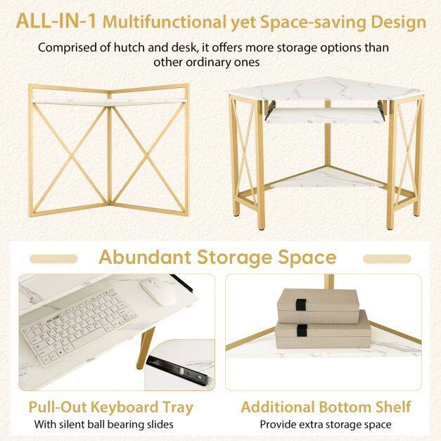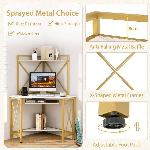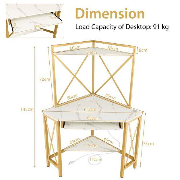 This multifunctional corner desk has a hutch and a desk to offer you varied storage options. The functional hutch is a nice place to display your books and decorations. The wide desktop, pull-out keyboard tray and bottom shelf provide lots of storage space for different items. In addition, the built-in charging station features 2 AC outlets and 2 USB ports for convenient charging and easy reach. More importantly, the space-saving corner desk is ideal for small spaces. The rust-proof metal frame is strong enough to bear a weight up to 150 kg, and adjustable foot pads increase overall stability.