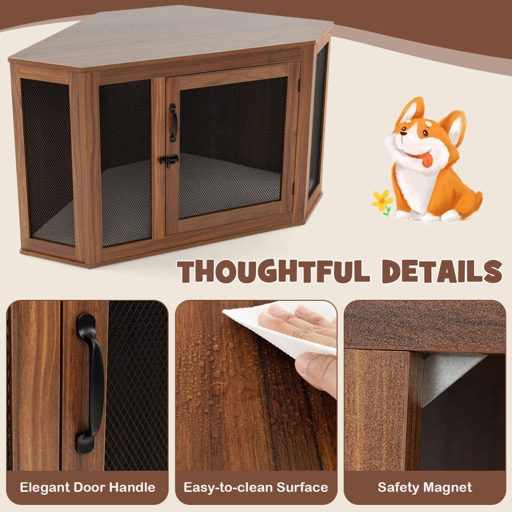 ● Durable Construction: This furniture corner dog crate is constructed of premium PB with advantages waterproof and wear-resistant, which is durable and easy to maintain. Besides, the thick metal mesh is bite-resistant to avoid damage from pets.