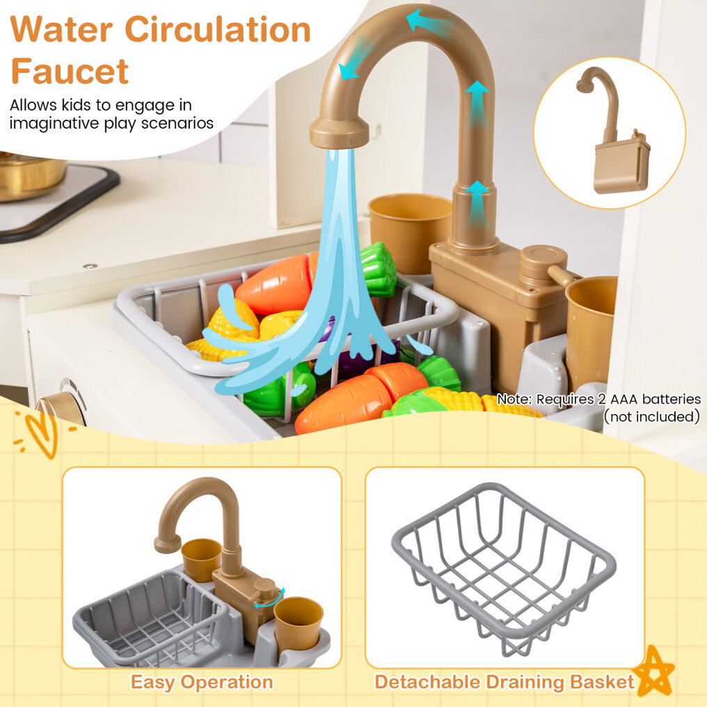 ● Interactive Stoves and Water Faucet: The stovetop allows kids to pretend to cook with realistic lights and sound. The water faucet, featuring unique water circulation system, enables kids to turn the faucet knob to turn the water on or off. Note: Require 2 AAA batteries (not included) to activate these functions.