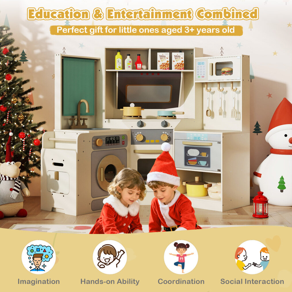 ● More Areas for Added Fun: To enhance overall delight, this corner play kitchen for kids comes with a range hood, microwave, sink with faucet, oven and dishwasher, all designed to simulate real-life kitchen activities. The addition of a curtain and washing machine adds layers of interactive joy.