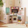 ● Child-Friendly Features: Crafted with children's safety in mind, this ASTM and CPSIA compliant corner kitchen set has a sturdy wooden build with a splinter-free surface and rounded edges. The kid-friendly accessories, such as utensils and vegetables, encourage enriching playtime experiences.