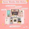 ● Space-Saving Corner Design: Featuring a unique corner design, this wooden play kitchen fits seamlessly into your corner, providing ample space for multiple children to cook and play together. This smart structure not only saves space but also makes playtime more engaging and accessible.