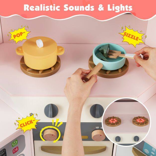 ● Interactive Role-Play Options: The corner wooden kids kitchen boasts 2 stoves with lights and sounds that will ignite your child's culinary imagination, while the rotary knobs make a "click" sound for more realism. Equipped with a convenient handle and safe door lock, the trash bin is easy for kids to push or pull.