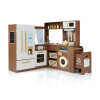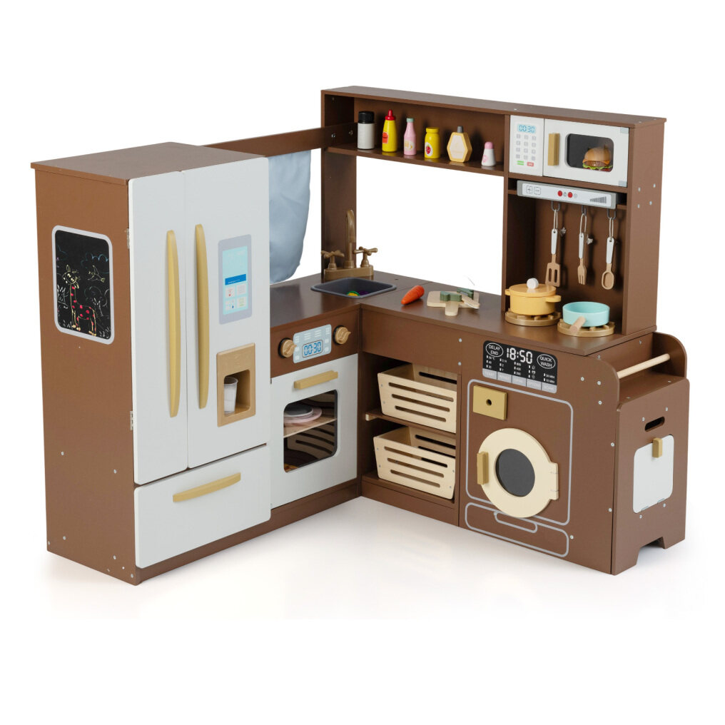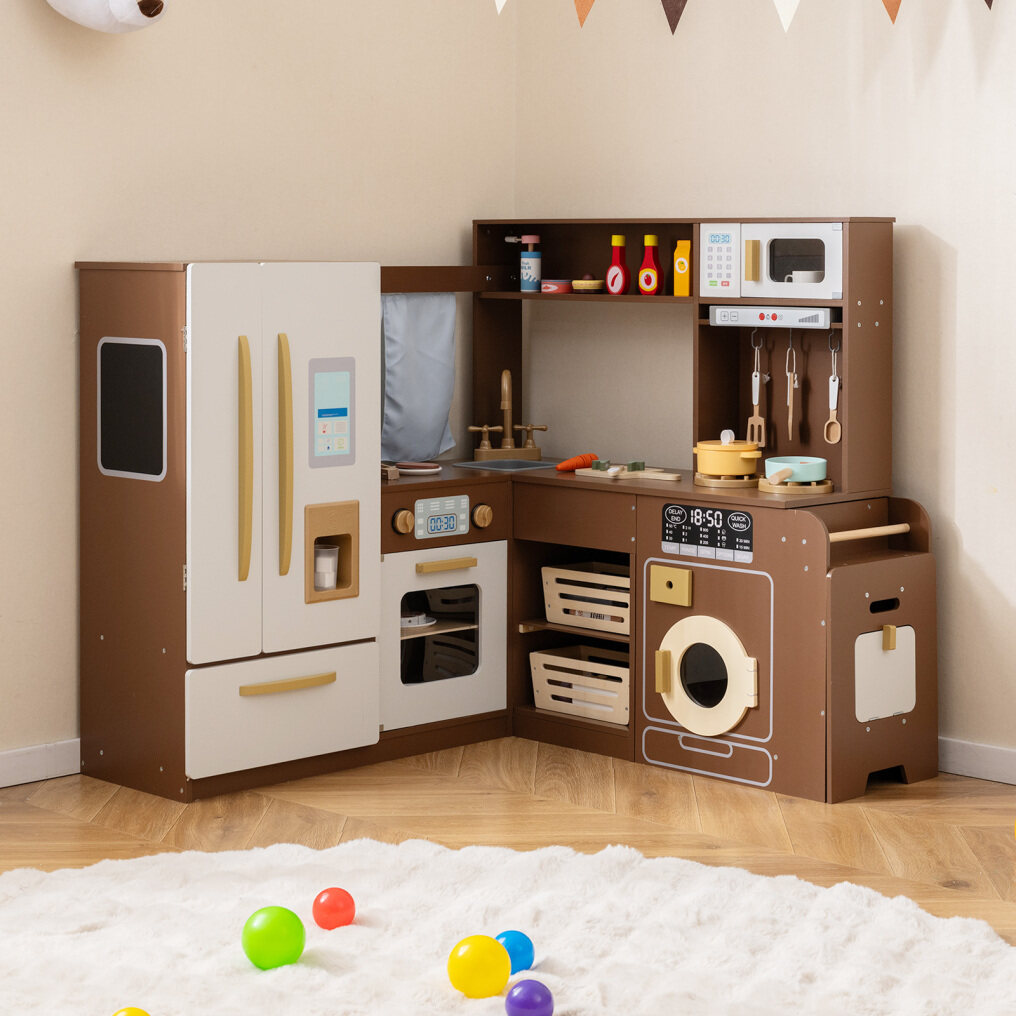 ● Diverse Areas for Unlimited Fun: Designed with more gameplay options, this large wooden corner play kitchen invites kids to draw on the blackboard, bake in the oven, wash in the washing machine, cut on the 2 countertops, heat in the microwave. The open compartment, hanging hooks and laundry baskets help assort items.