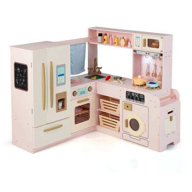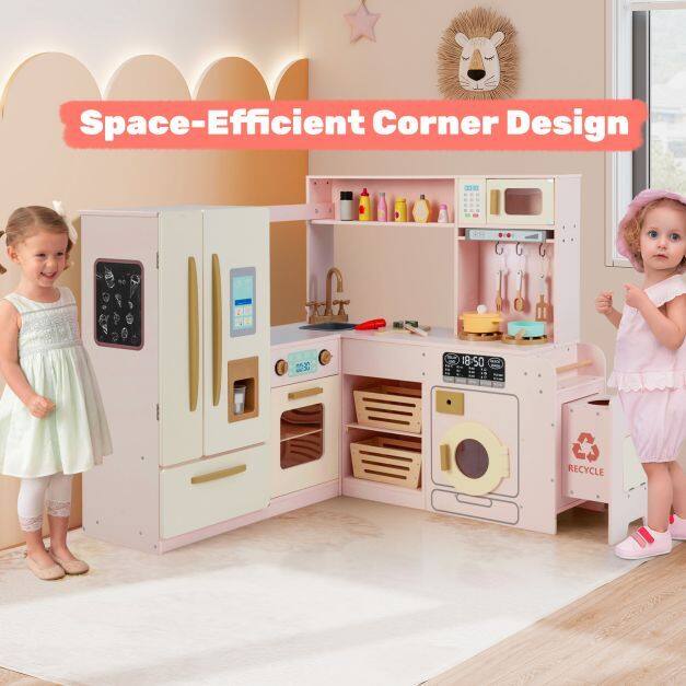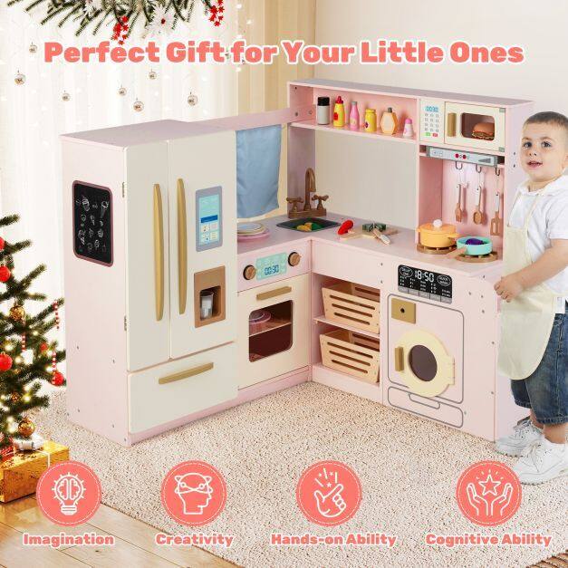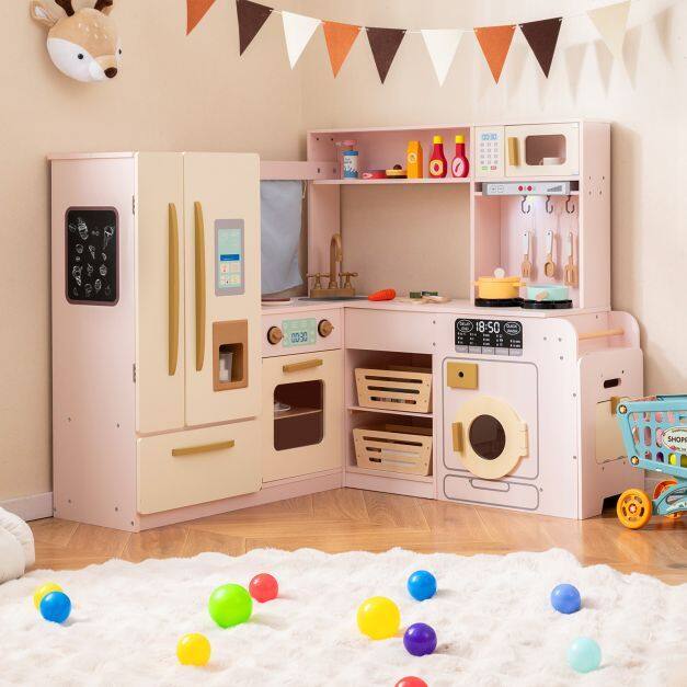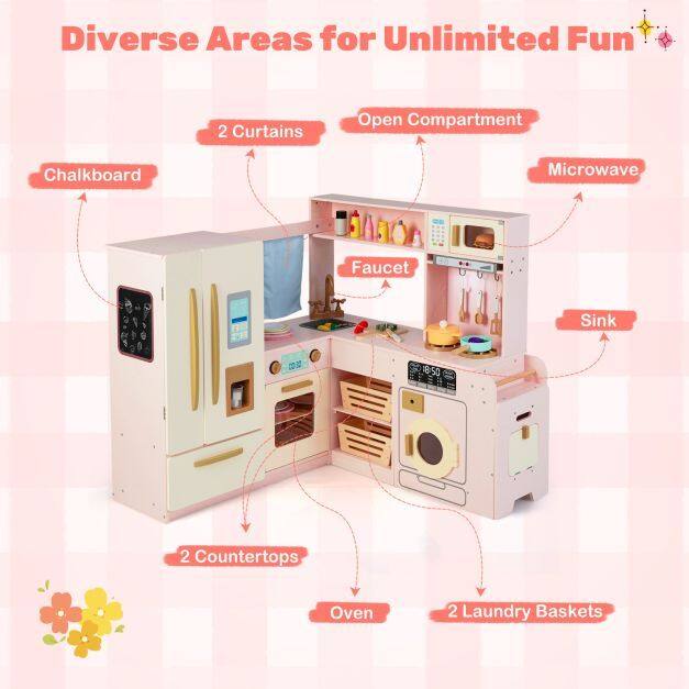 ● Diverse Areas for Unlimited Fun: Designed with more gameplay options, this large wooden corner play kitchen invites kids to draw on the blackboard, bake in the oven, wash in the washing machine, cut on the 2 countertops, heat in the microwave. The open compartment, hanging hooks and laundry baskets help assort items.