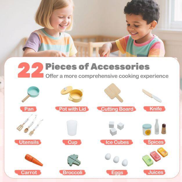 ● Perfect Gift for Your Little Ones: The large toddler cooking playset complies with ASTM and CPSIA, ensuring a safe play environment for children over 3 years old. Apart from simulation appliances, there are also 22 accessories – pan, pot with lid, cutting board, knife, 3 utensils, cup, 3 ice cubes, 3 spices, carrot, broccoli, 3 eggs and 3 juices.