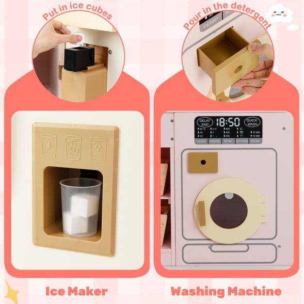 ● Realistic Light & Sound Effects: Featuring real lights and sounds on the range hood and stoves, this pretend play corner kitchen will engage your child's senses. The knobs make a satisfying "click" sound as they are turned, enhancing the immersive play experience.